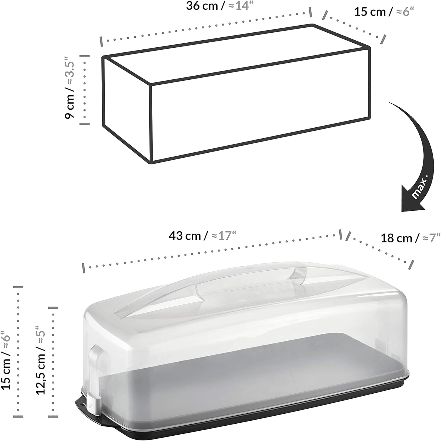 • LIEFERUMFRANG - 1x Rechteckige Transportbox für rechteckige Torten und Kuchen, mit Klick-Verschluss und Tragegriff, 15 x 43 x 18 cm hoch, Made in Germany