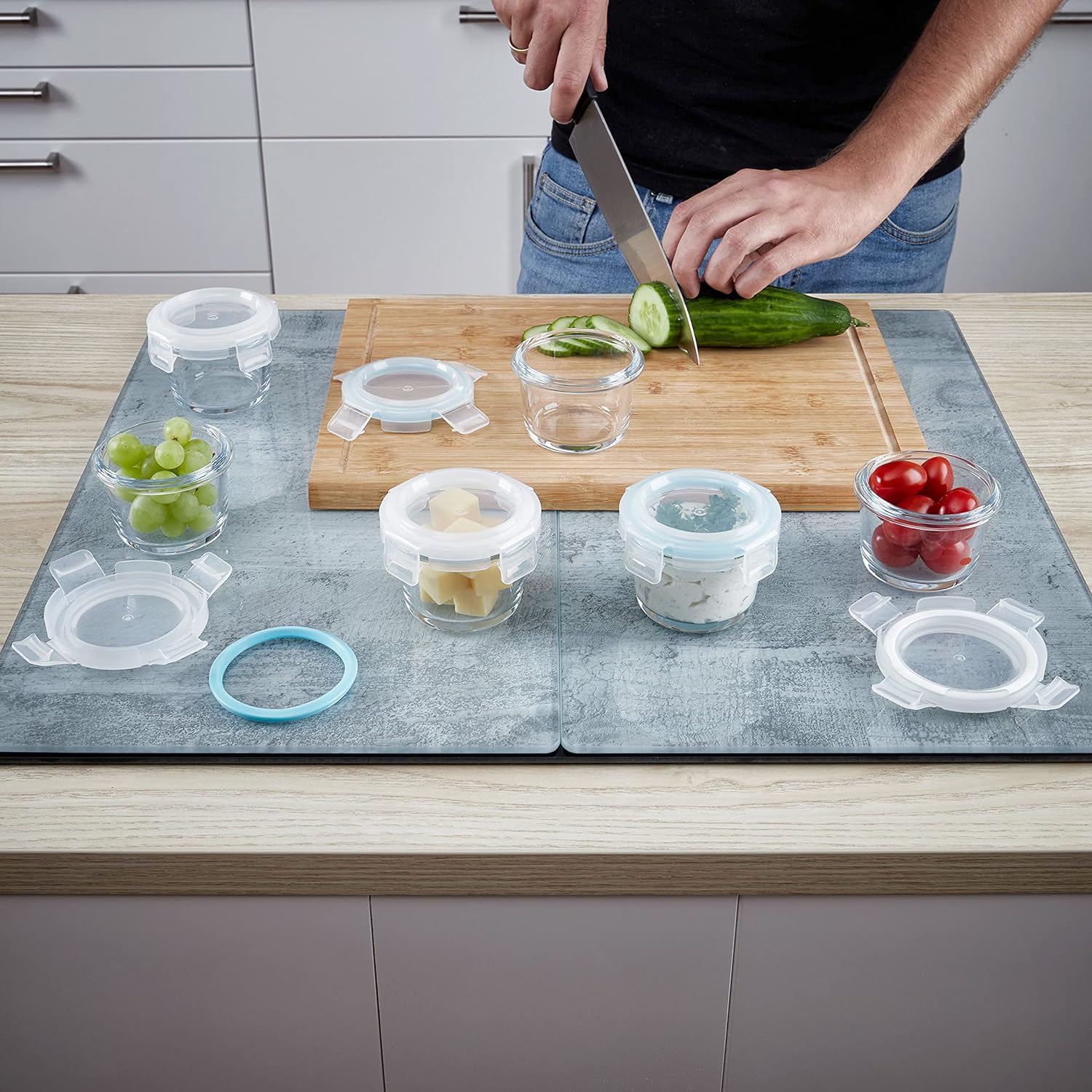 - Glasbehälter stapelbar - perfekt als Geschirr oder Dose für die Aufbewahrung von Lebensmitteln und BPA frei für Kinder - und Babynahrung. Die Aussenmasse jeder Glasbox (mit Deckel) betragen ø 9 x 7 cm