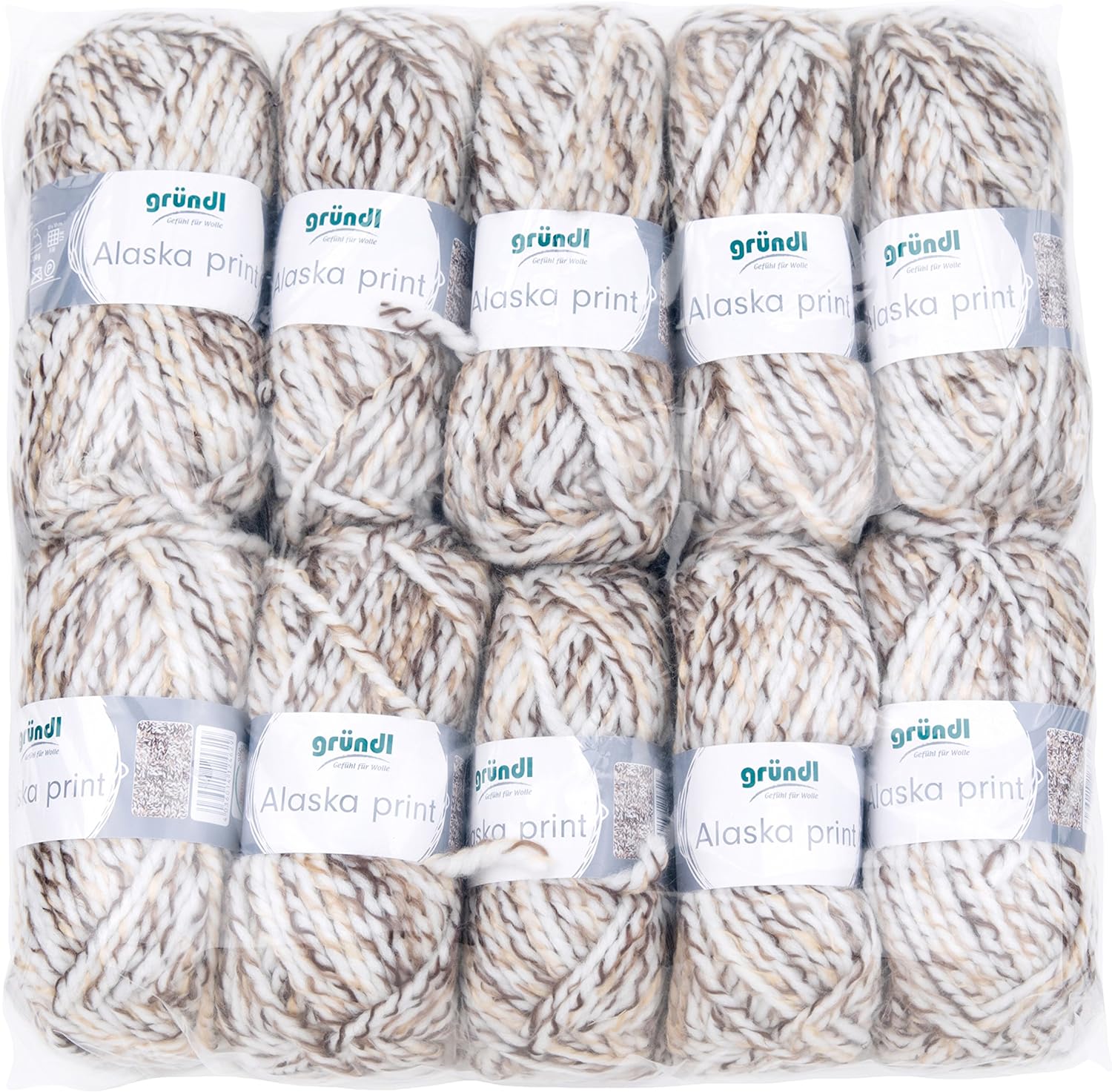 - LIEFERUMFANG & WEITERE EIGENSCHAFTEN: Gründl Alaska print, 10 x 100 g / 80 % Polyacryl, 20 % Wolle / Maschenprobe: 9 M x 12 R = 10 x 10 cm / Materialverbrauch: Pullover (Gr. 38) = ca. 800 g