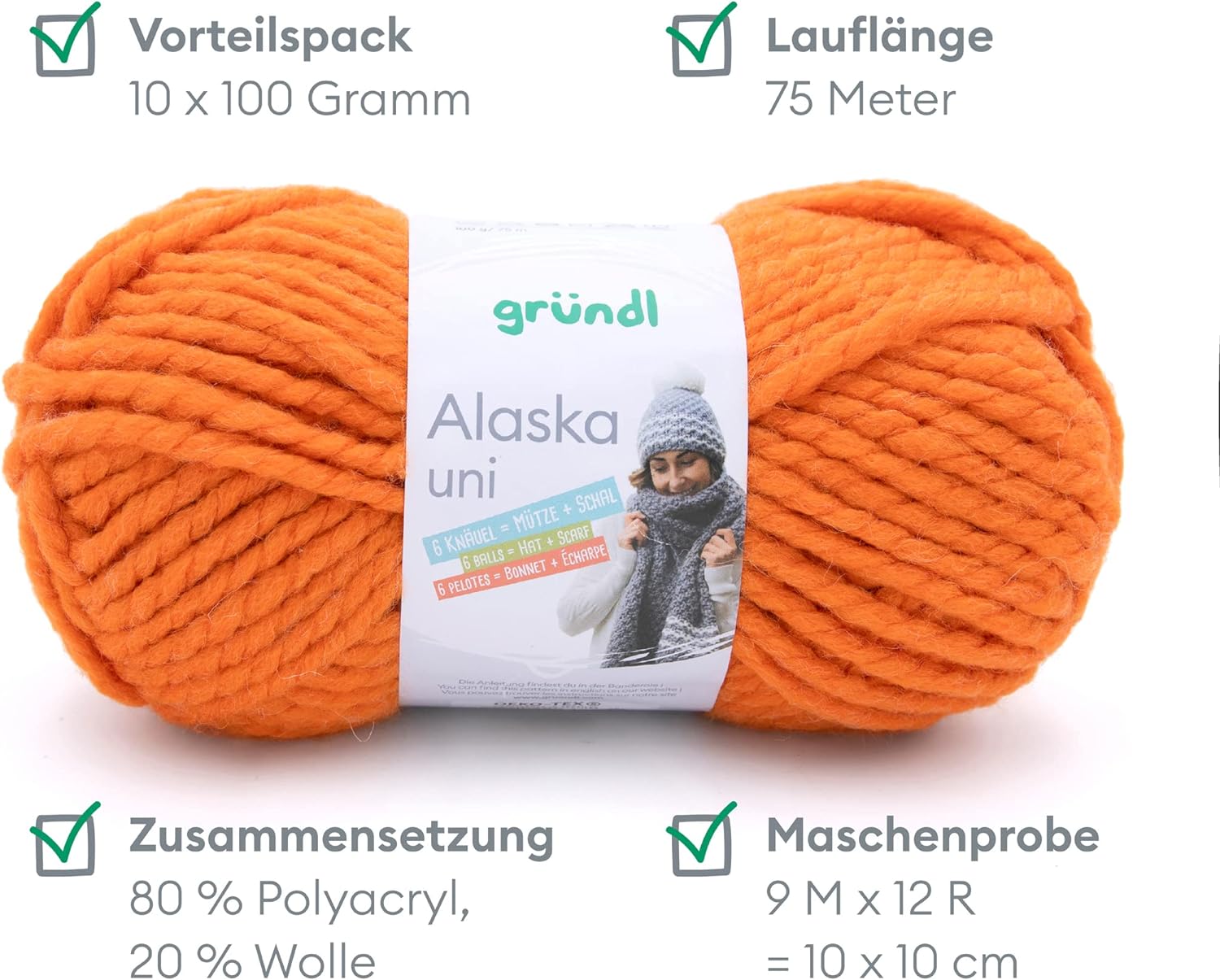 - LIEFERUMFANG & WEITERE EIGENSCHAFTEN: Gründl Alaska uni, 10 x 100 g / 80 % Polyacryl, 20 % Wolle / Maschenprobe: 9 M x 12 R = 10 x 10 cm / Materialverbrauch: Pullover (Gr. 38) = ca. 800 g