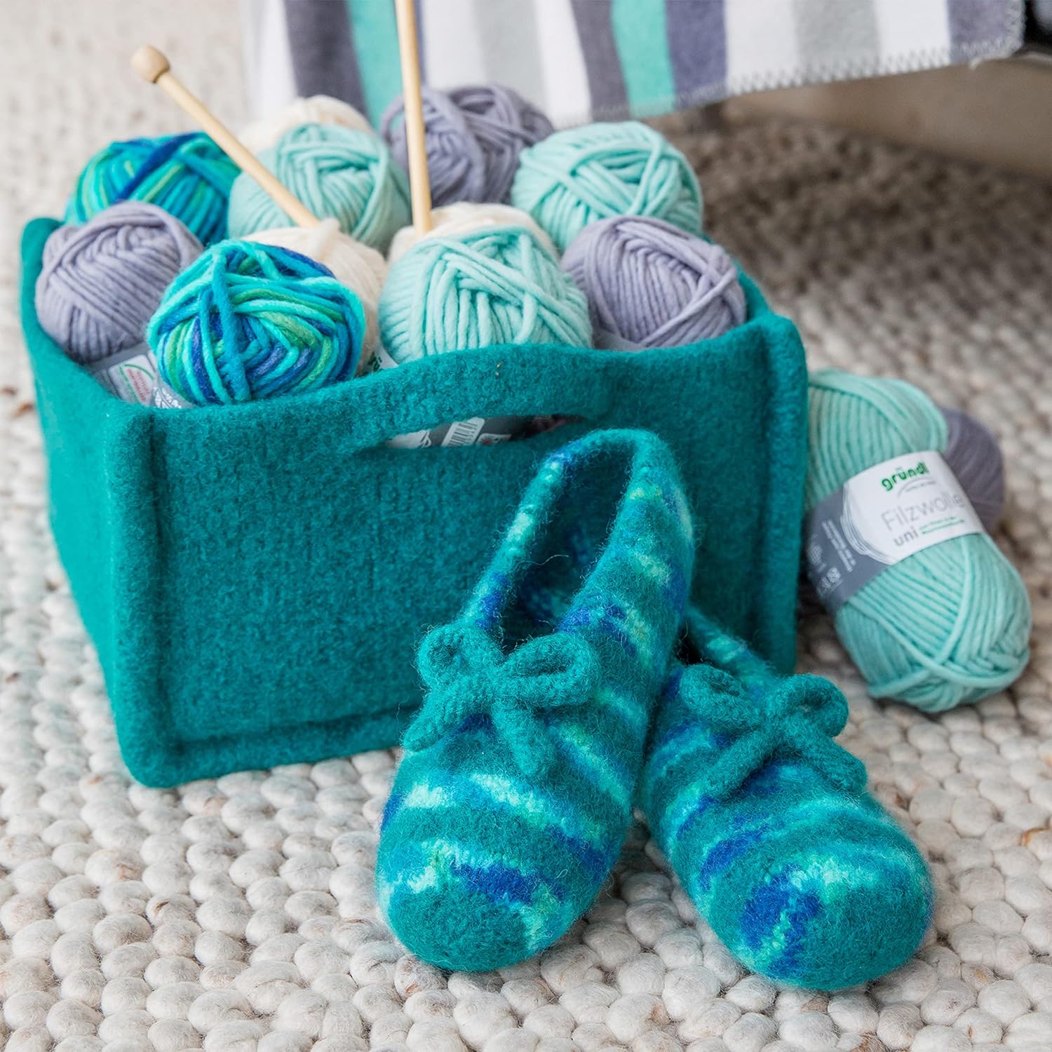 • LIEFERUMFANG & WEITERE EIGENSCHAFTEN: Gründl Filzwolle uni, 10 x 50 g / 100 % Schurwolle / Maschenprobe (ungefilzt): 11 M x 16 R = 10 x 10 cm / Materialverbrauch: Pantoffel (Gr. 40 / 41) = ca. 200 g
