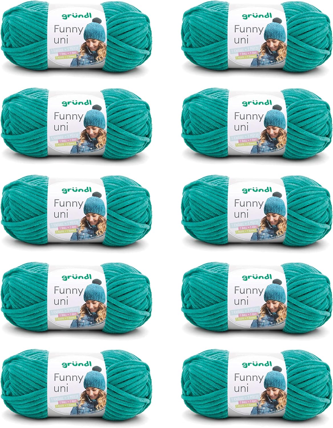 - LIEFERUMFANG & WEITERE EIGENSCHAFTEN: Gründl Funny uni Wolle, 10 x 100 g / 100 % Polyester / Maschenprobe: 11 M x 20 R = 10 x 10 cm / Materialverbrauch: Pullover (Gr. 38) = ca. 500 g