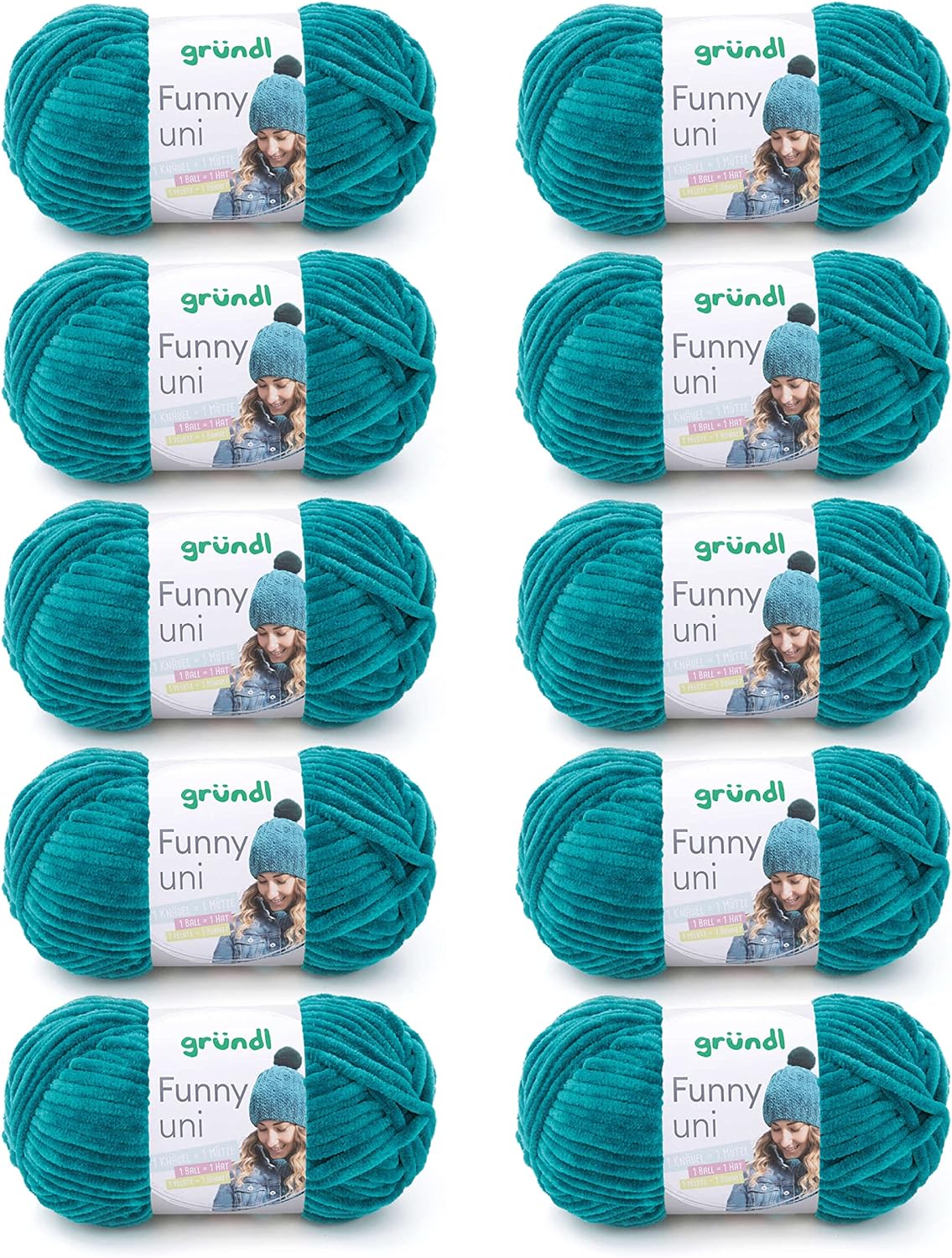 - LIEFERUMFANG & WEITERE EIGENSCHAFTEN: Gründl Funny uni Wolle, 10 x 100 g / 100 % Polyester / Maschenprobe: 11 M x 20 R = 10 x 10 cm / Materialverbrauch: Pullover (Gr. 38) = ca. 500 g