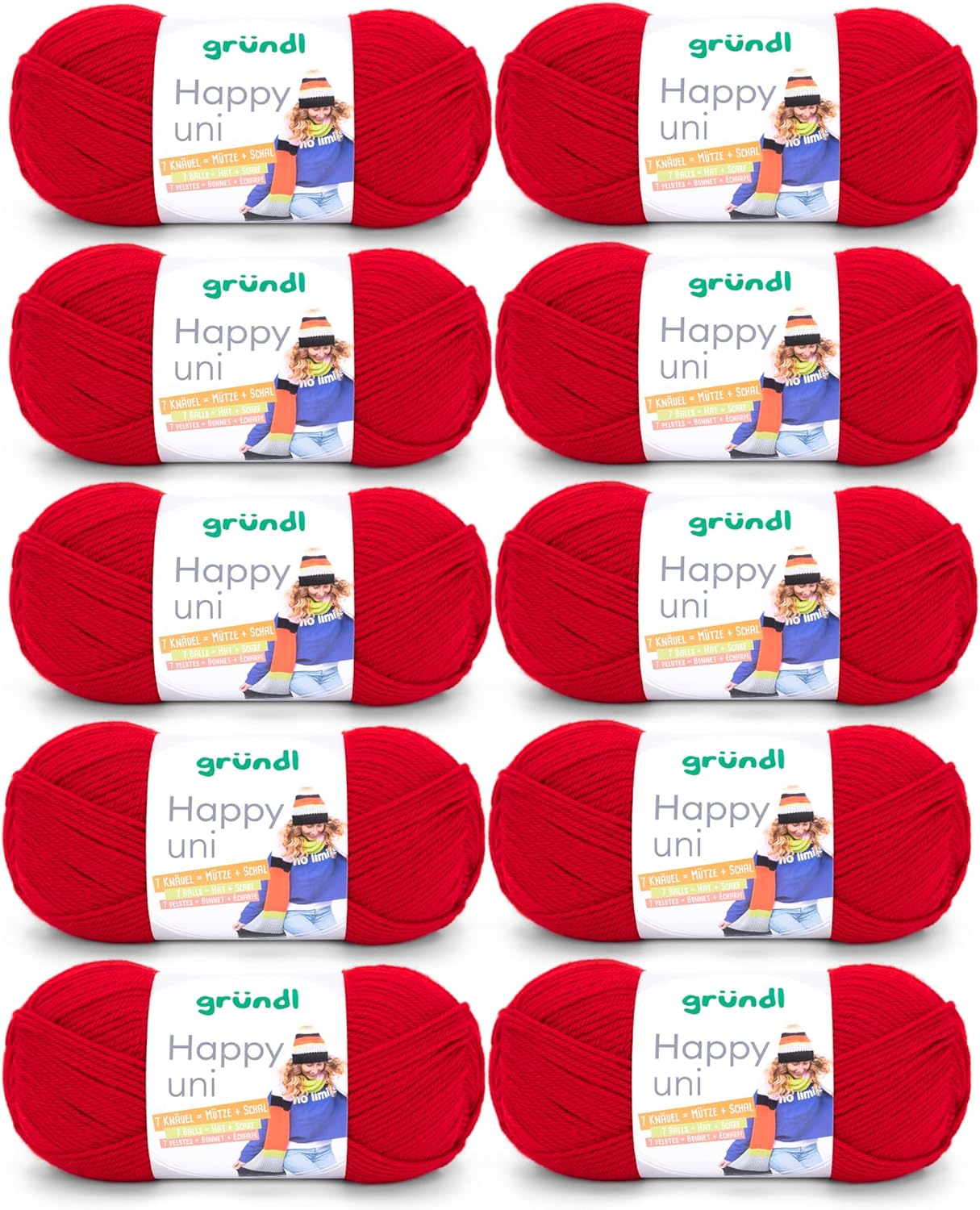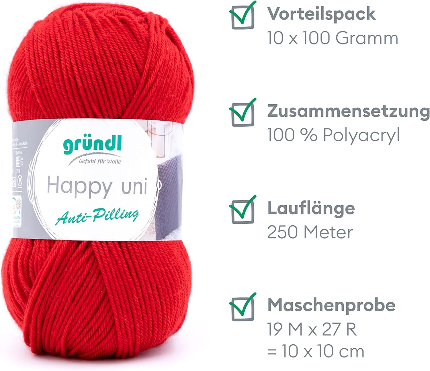 - LIEFERUMFANG & WEITERE EIGENSCHAFTEN: Gründl Happy uni, 10 x 100 g / 100 % Polyacryl / Anti-Pilling / Maschenprobe: 19 M x 27 R = 10 x 10 cm / Materialverbrauch: Pullover (Gr. 38) = ca. 500 g