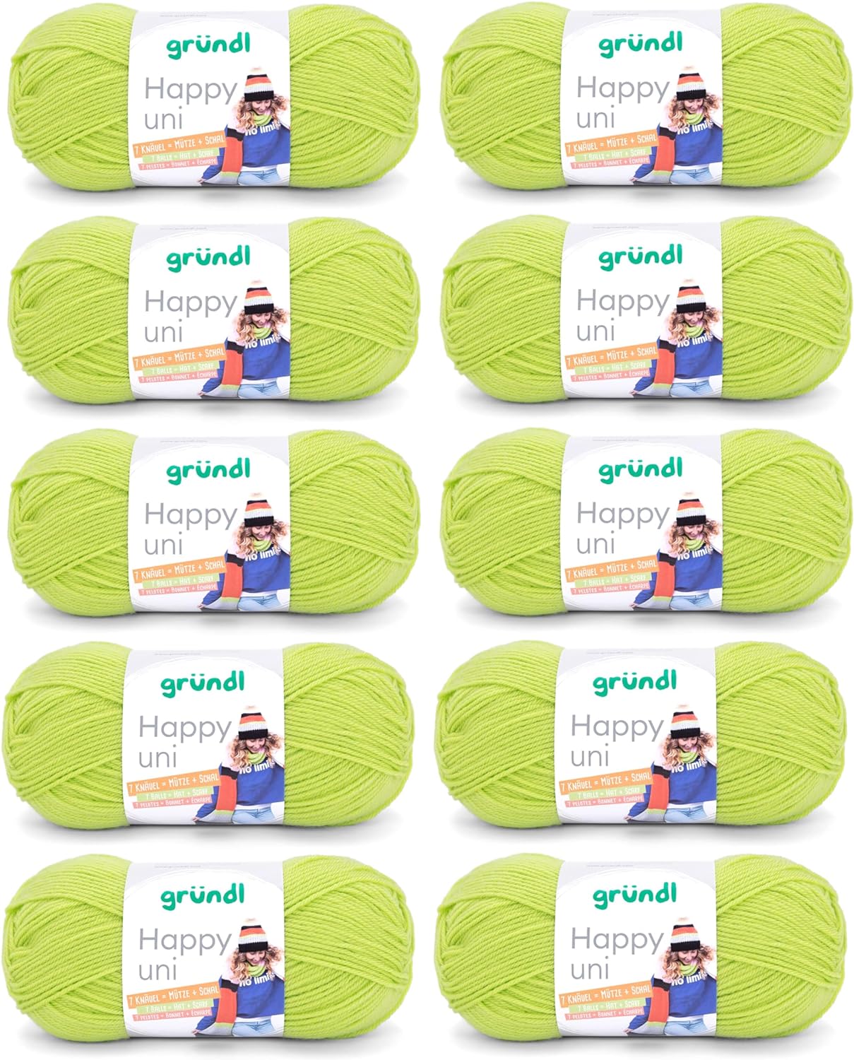 - LIEFERUMFANG & WEITERE EIGENSCHAFTEN: Gründl Happy uni, 10 x 100 g / 100 % Polyacryl / Anti-Pilling / Maschenprobe: 19 M x 27 R = 10 x 10 cm / Materialverbrauch: Pullover (Gr. 38) = ca. 500 g