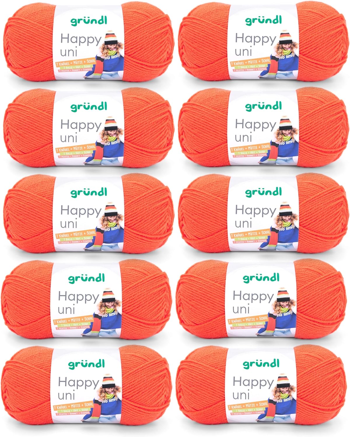- LIEFERUMFANG & WEITERE EIGENSCHAFTEN: Gründl Happy uni, 10 x 100 g / 100 % Polyacryl / Anti-Pilling / Maschenprobe: 19 M x 27 R = 10 x 10 cm / Materialverbrauch: Pullover (Gr. 38) = ca. 500 g