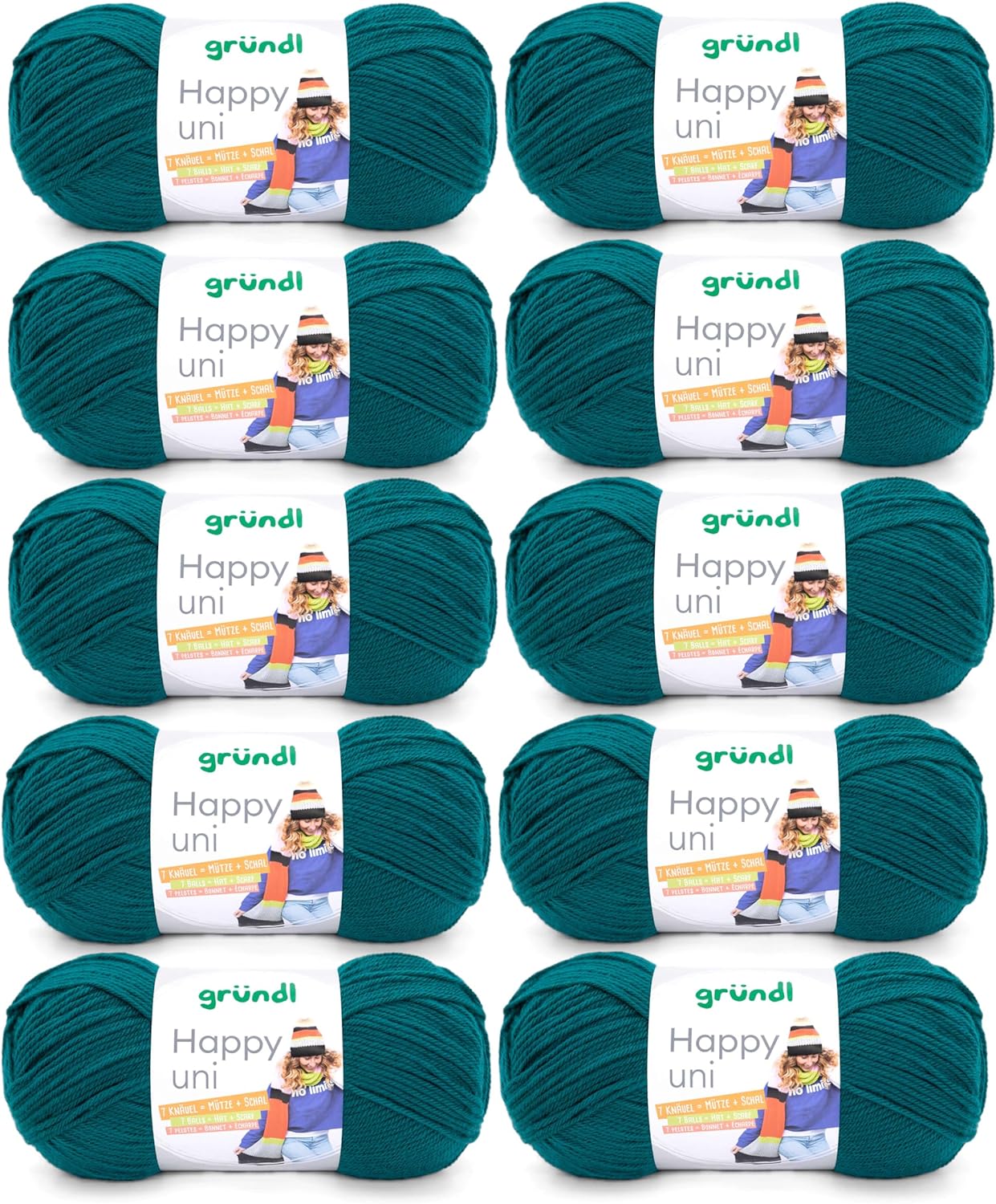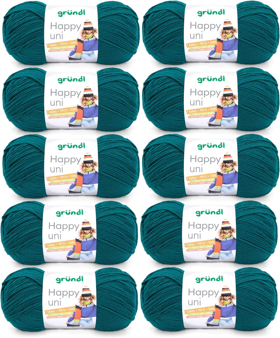 - LIEFERUMFANG & WEITERE EIGENSCHAFTEN: Gründl Happy uni, 10 x 100 g / 100 % Polyacryl / Anti-Pilling / Maschenprobe: 19 M x 27 R = 10 x 10 cm / Materialverbrauch: Pullover (Gr. 38) = ca. 500 g