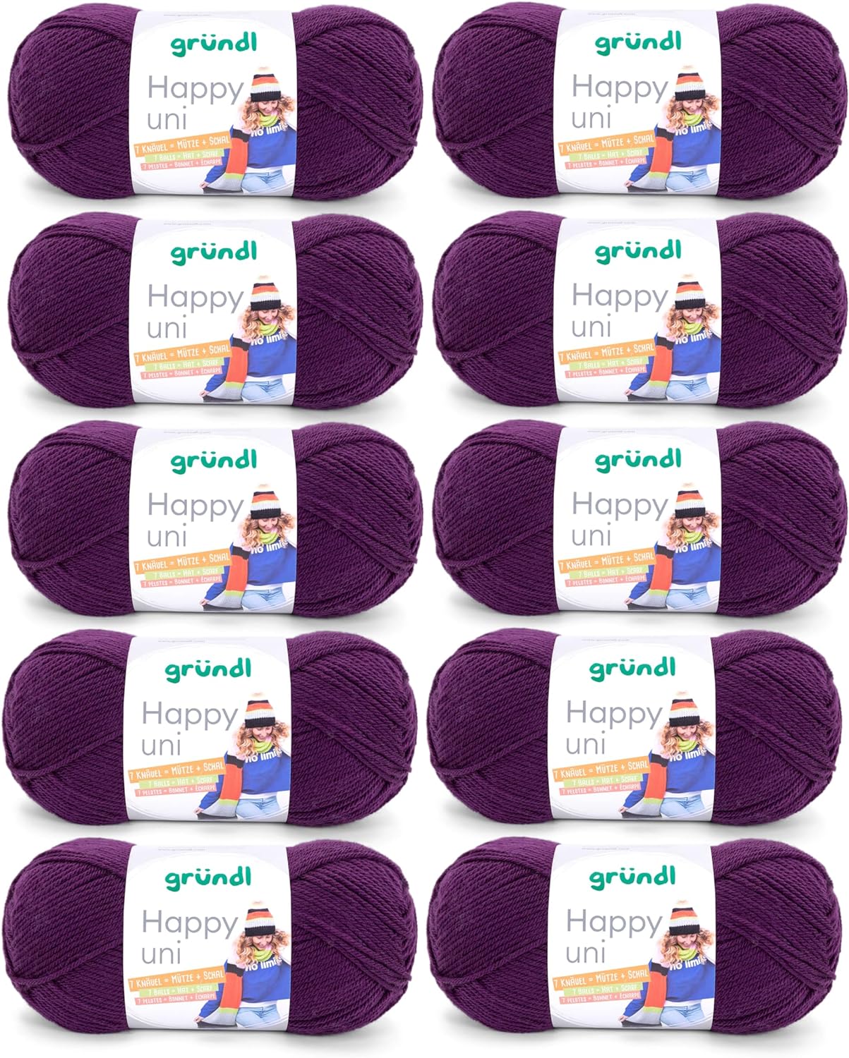 - LIEFERUMFANG & WEITERE EIGENSCHAFTEN: Gründl Happy uni, 10 x 100 g / 100 % Polyacryl / Anti-Pilling / Maschenprobe: 19 M x 27 R = 10 x 10 cm / Materialverbrauch: Pullover (Gr. 38) = ca. 500 g