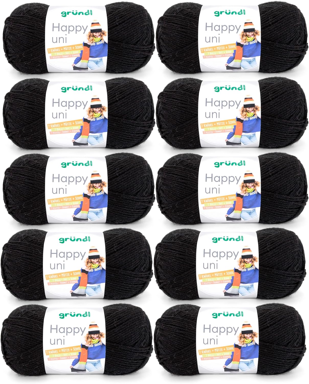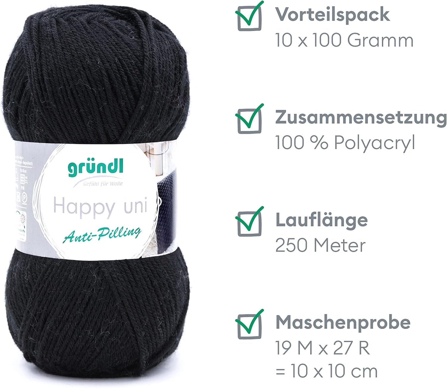 - LIEFERUMFANG & WEITERE EIGENSCHAFTEN: Gründl Happy uni, 10 x 100 g / 100 % Polyacryl / Anti-Pilling / Maschenprobe: 19 M x 27 R = 10 x 10 cm / Materialverbrauch: Pullover (Gr. 38) = ca. 500 g