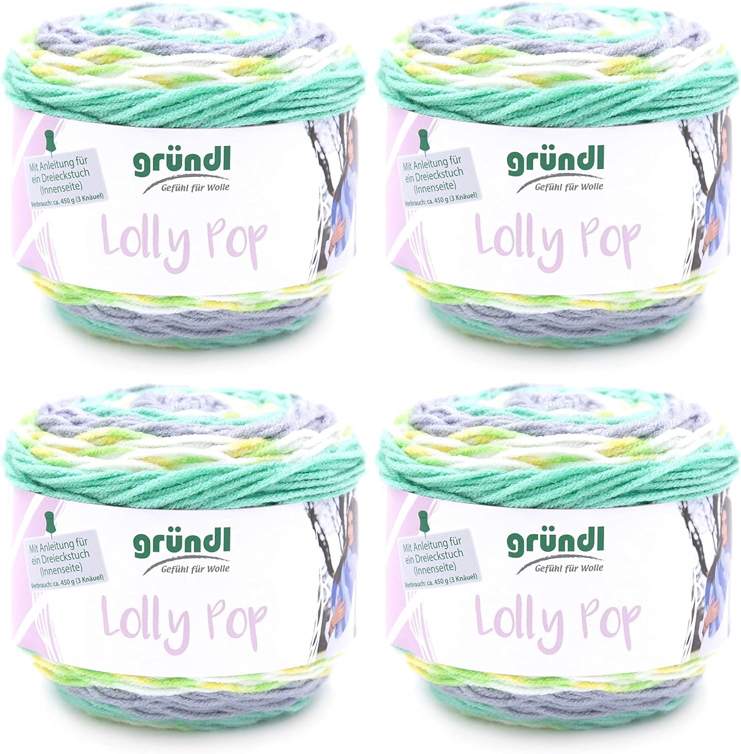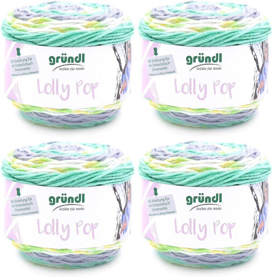 - LIEFERUMFANG & WEITERE EIGENSCHAFTEN: Gründl Lolly Pop Handstrickgarn / Häkelgarn, 4 x 150 g / 100 % Polyacryl / Maschenprobe: 16 M x 21 R = 10 x 10 cm / Materialverbrauch: Pullover (Gr. 38) = ca. 600 g