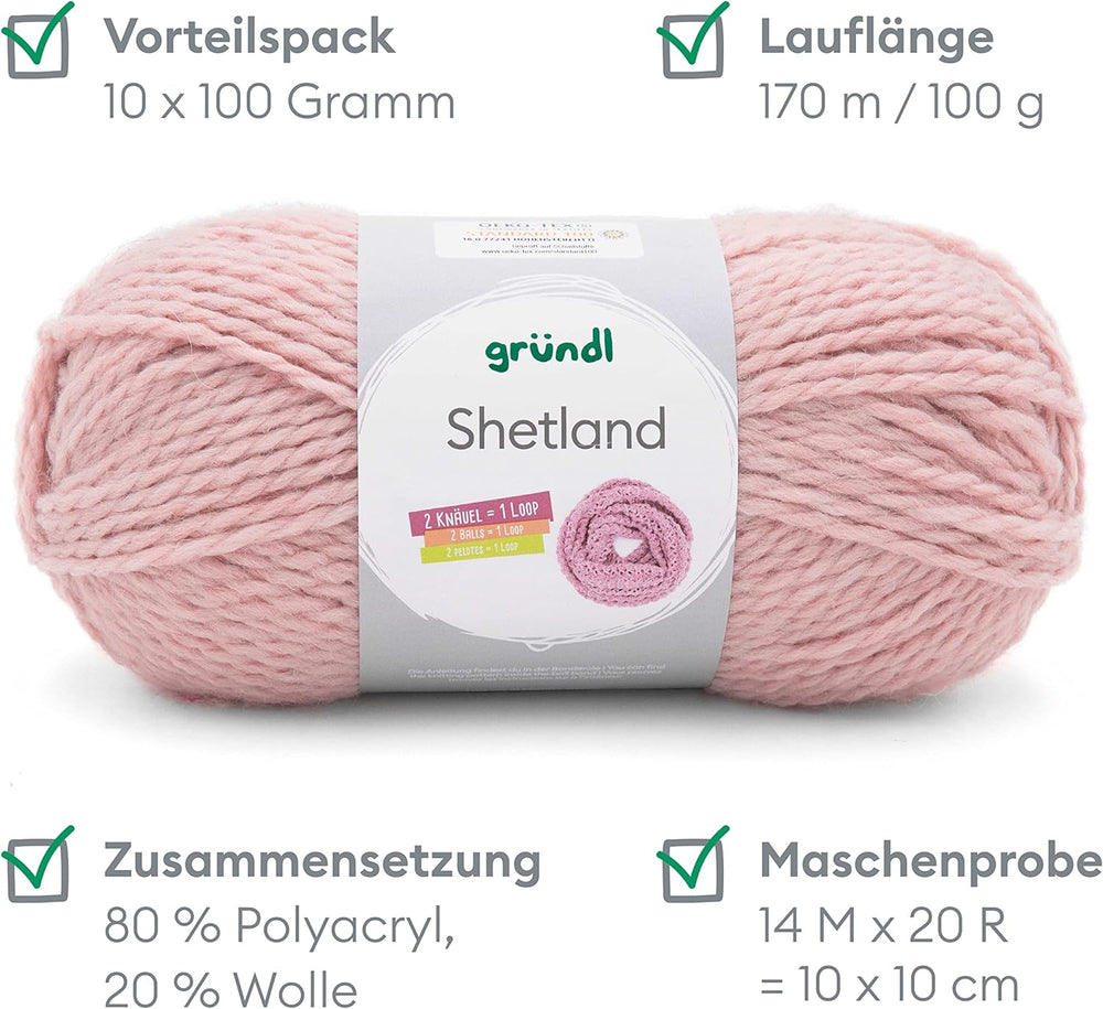 - LIEFERUMFANG & WEITERE EIGENSCHAFTEN: Gründl Shetland, 10 x 100 g / 80 % Polyacryl & 20 % Wolle / Maschenprobe: 14 M x 20 R = 10 x 10 cm / Materialverbrauch: Pullover (Gr. 38) = ca. 500 g
