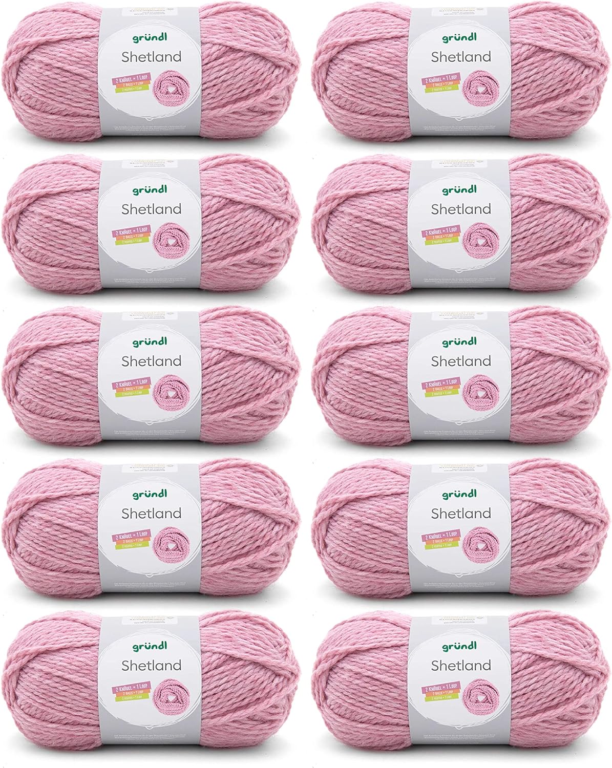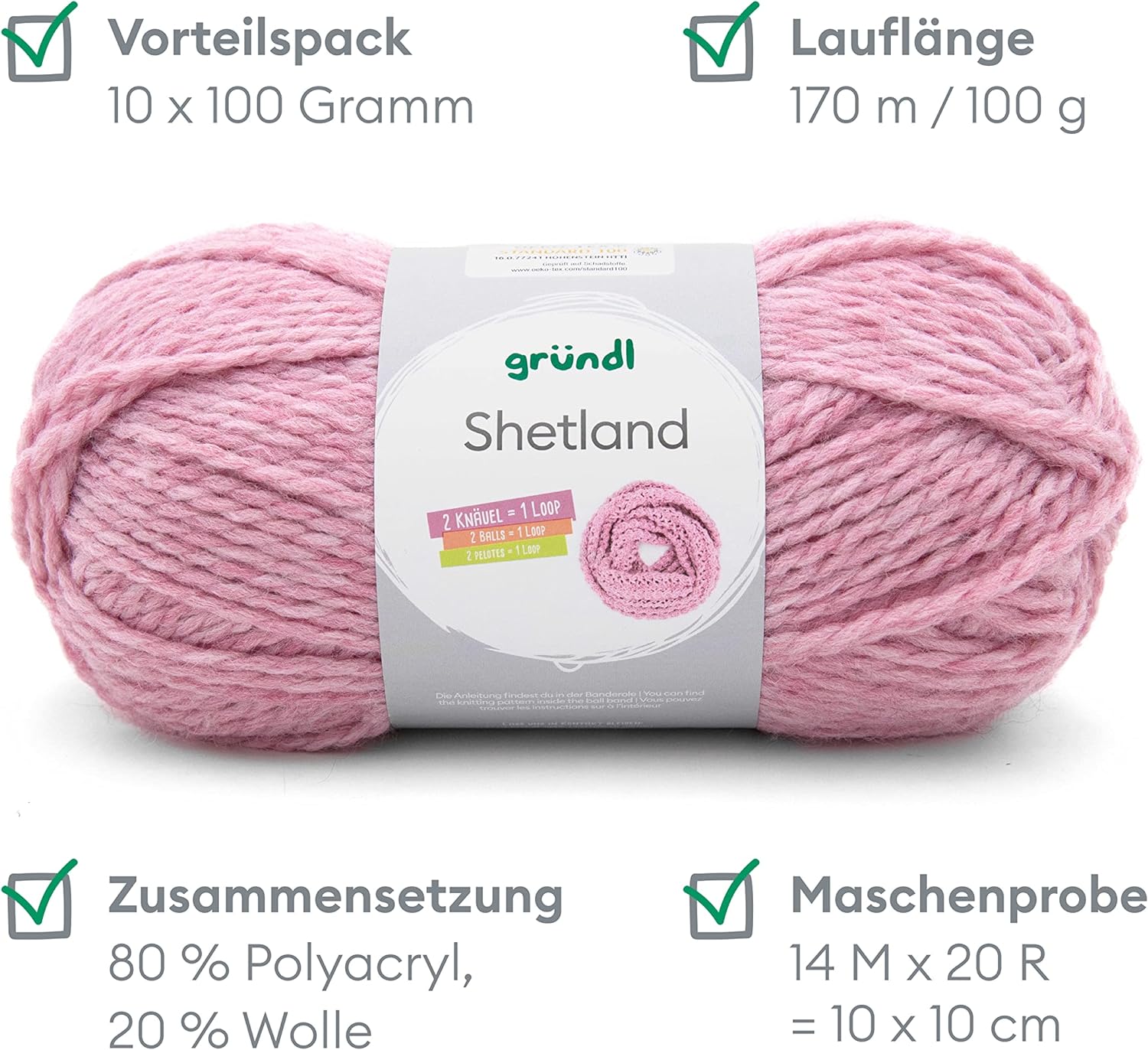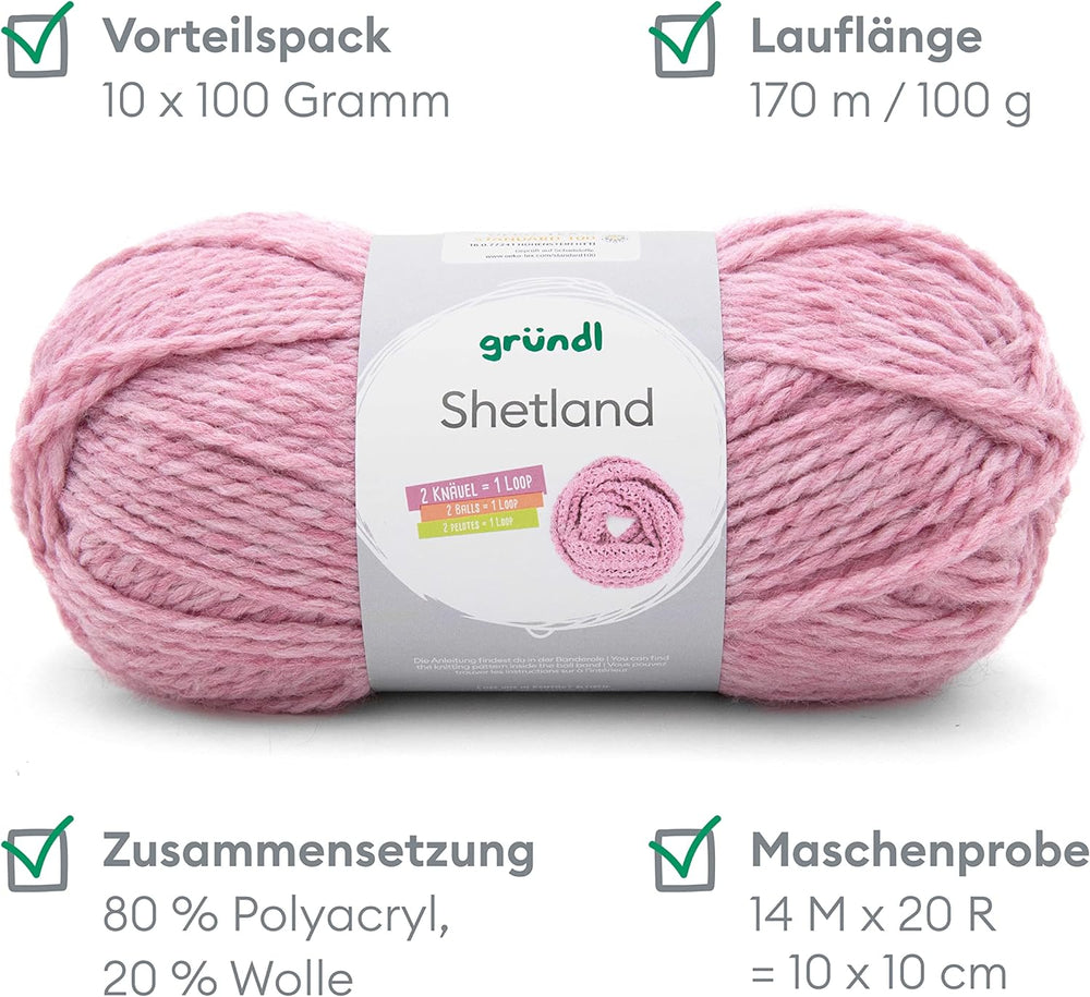 - LIEFERUMFANG & WEITERE EIGENSCHAFTEN: Gründl Shetland, 10 x 100 g / 80 % Polyacryl & 20 % Wolle / Maschenprobe: 14 M x 20 R = 10 x 10 cm / Materialverbrauch: Pullover (Gr. 38) = ca. 500 g