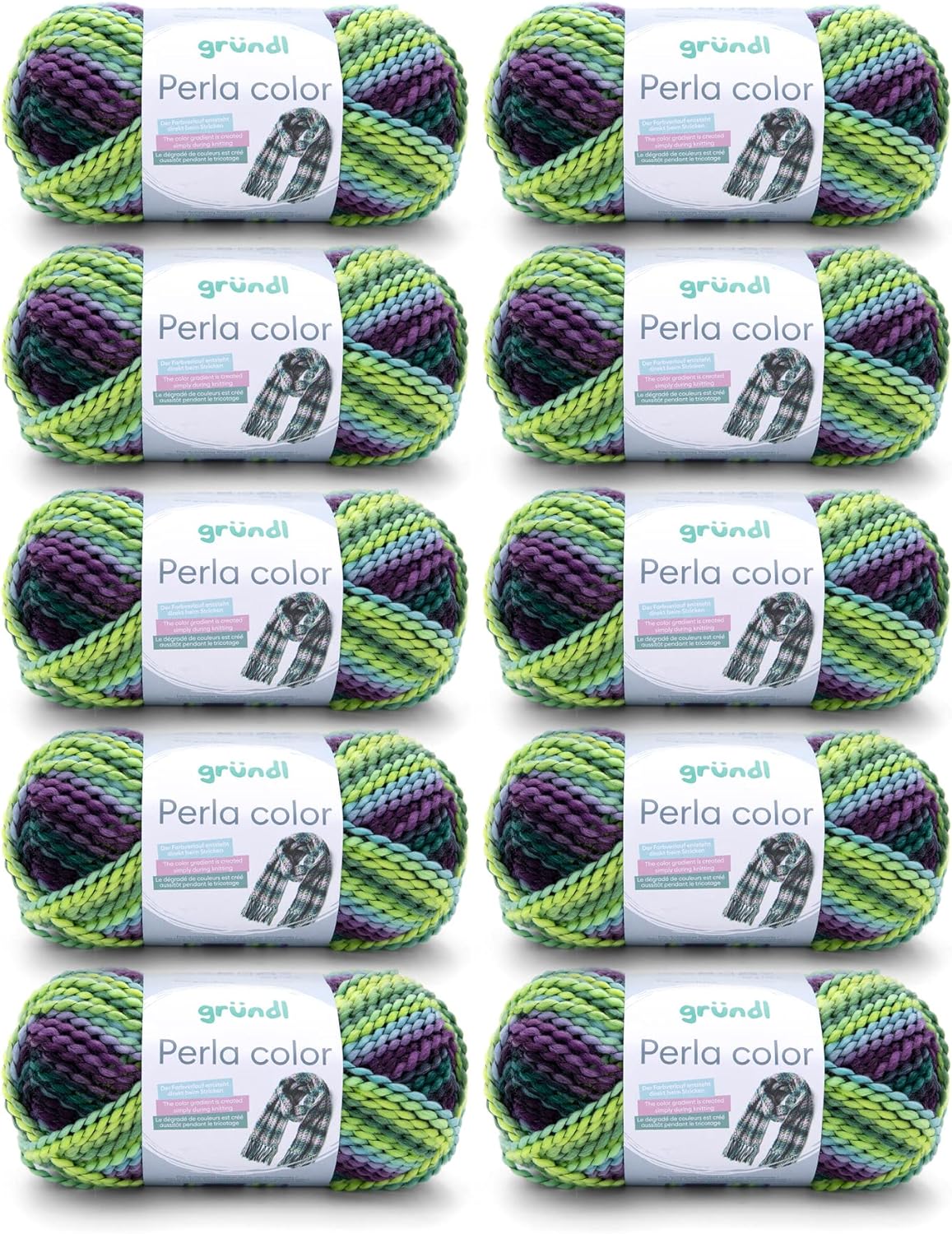- LIEFERUMFANG & WEITERE EIGENSCHAFTEN: Gründl Perla color, 10 x 100 g / 100 % Polyester / Maschenprobe: 12 M x 18 R = 10 x 10 cm / Materialverbrauch: Pullover (Gr. 38) = ca. 700 g, Mütze = ca. 100 g