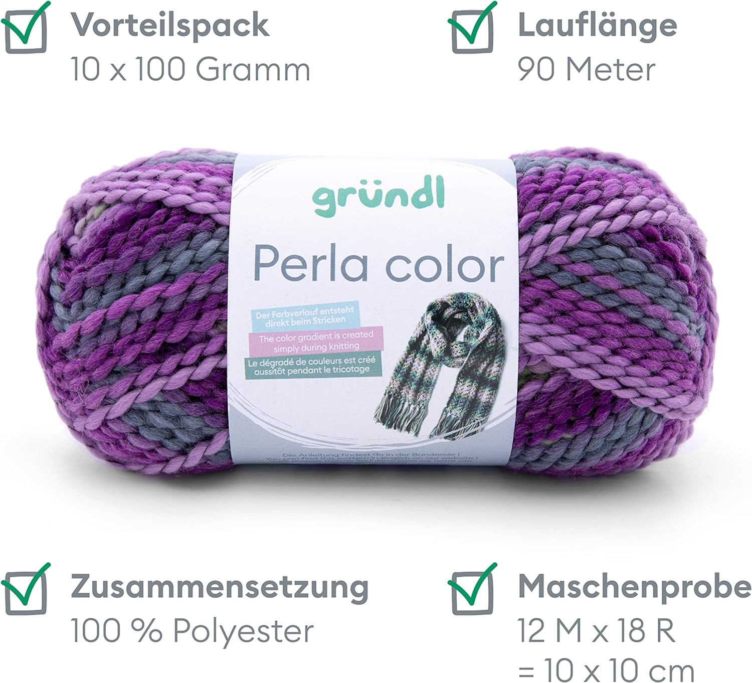 - LIEFERUMFANG & WEITERE EIGENSCHAFTEN: Gründl Perla color, 10 x 100 g / 100 % Polyester / Maschenprobe: 12 M x 18 R = 10 x 10 cm / Materialverbrauch: Pullover (Gr. 38) = ca. 700 g, Mütze = ca. 100 g