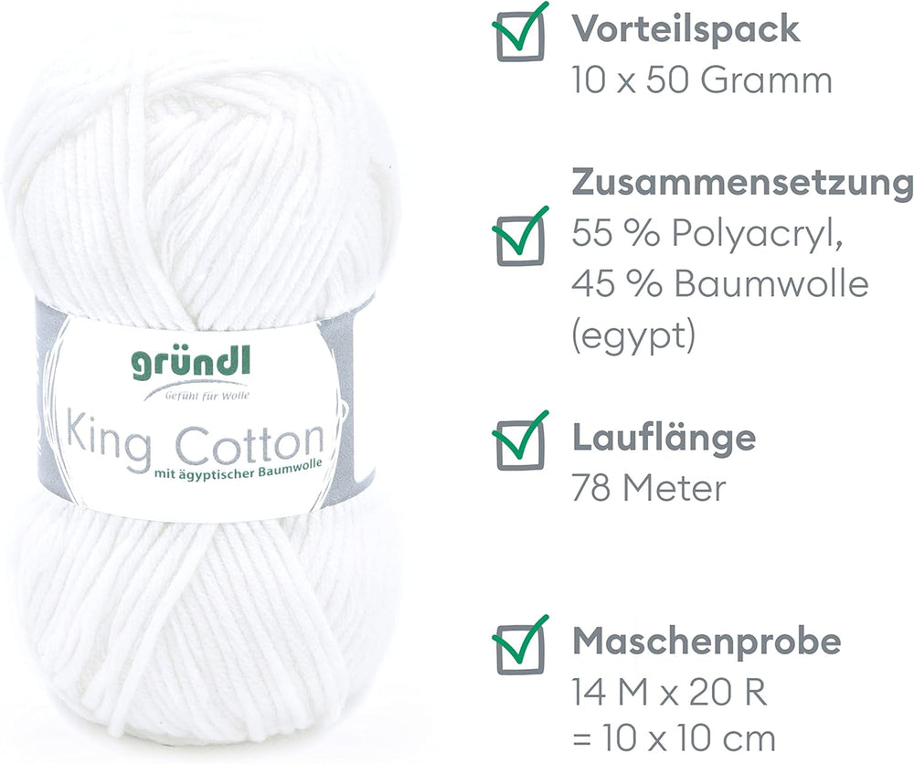 - UNIVERSALGARN FÜR JEDE JAHRESZEIT: Das voluminöse Garn lässt sich leicht verarbeiten. Ob für Sommer- oder Winterprojekte – das weiche Gründl Garn King Cotton ist mit einer Lauflänge von 50 g / 78 m vielseitig einsetzbar.