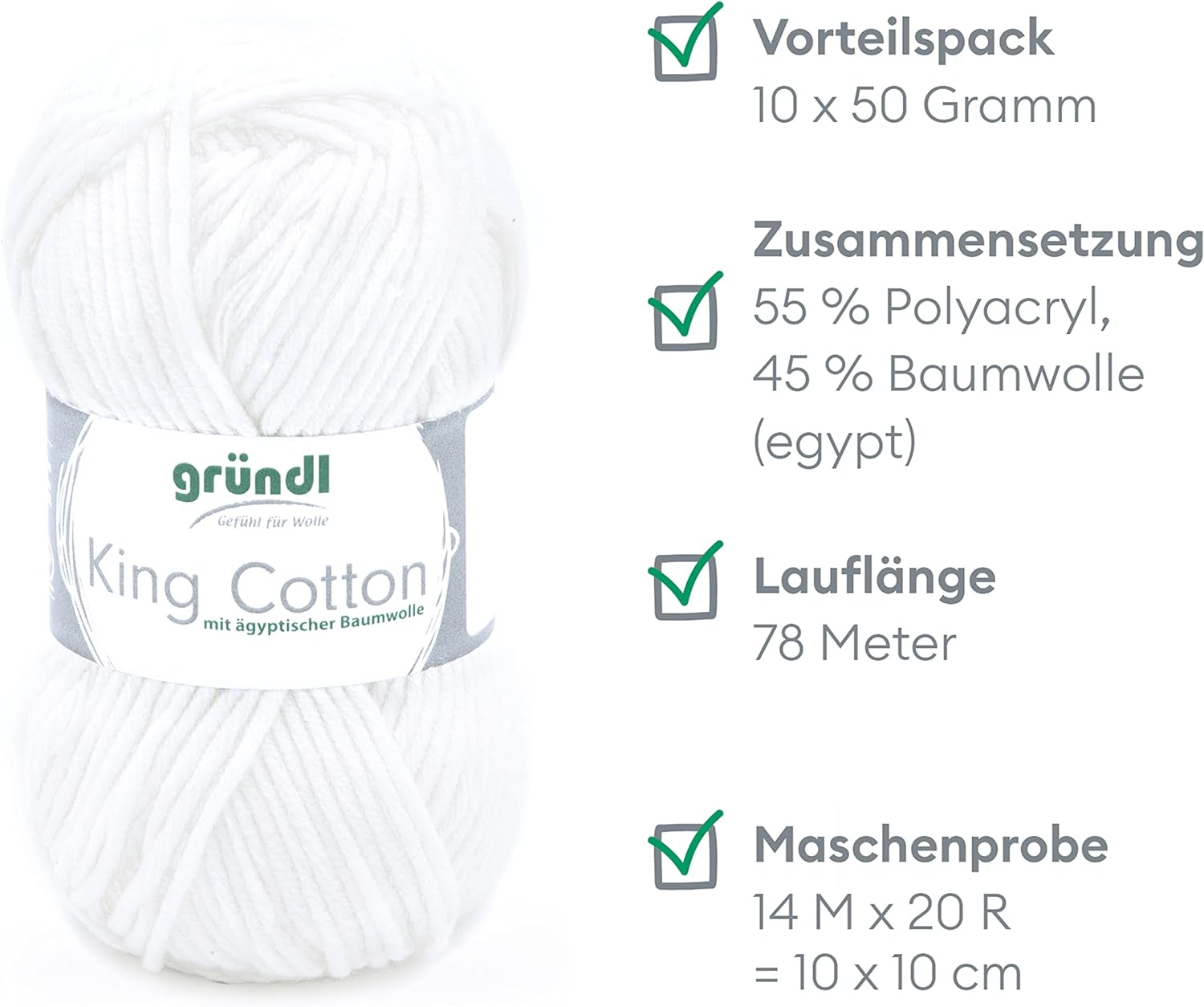 - LIEFERUMFANG & WEITERE EIGENSCHAFTEN: Gründl King Cotton, 10 x 50 g / 55 % Polyacryl, 45 % Baumwolle (egypt) / Maschenprobe: 14 M x 20 R = 10 x 10 cm / Materialverbrauch: Pullover (Gr. 38) = ca. 650 g