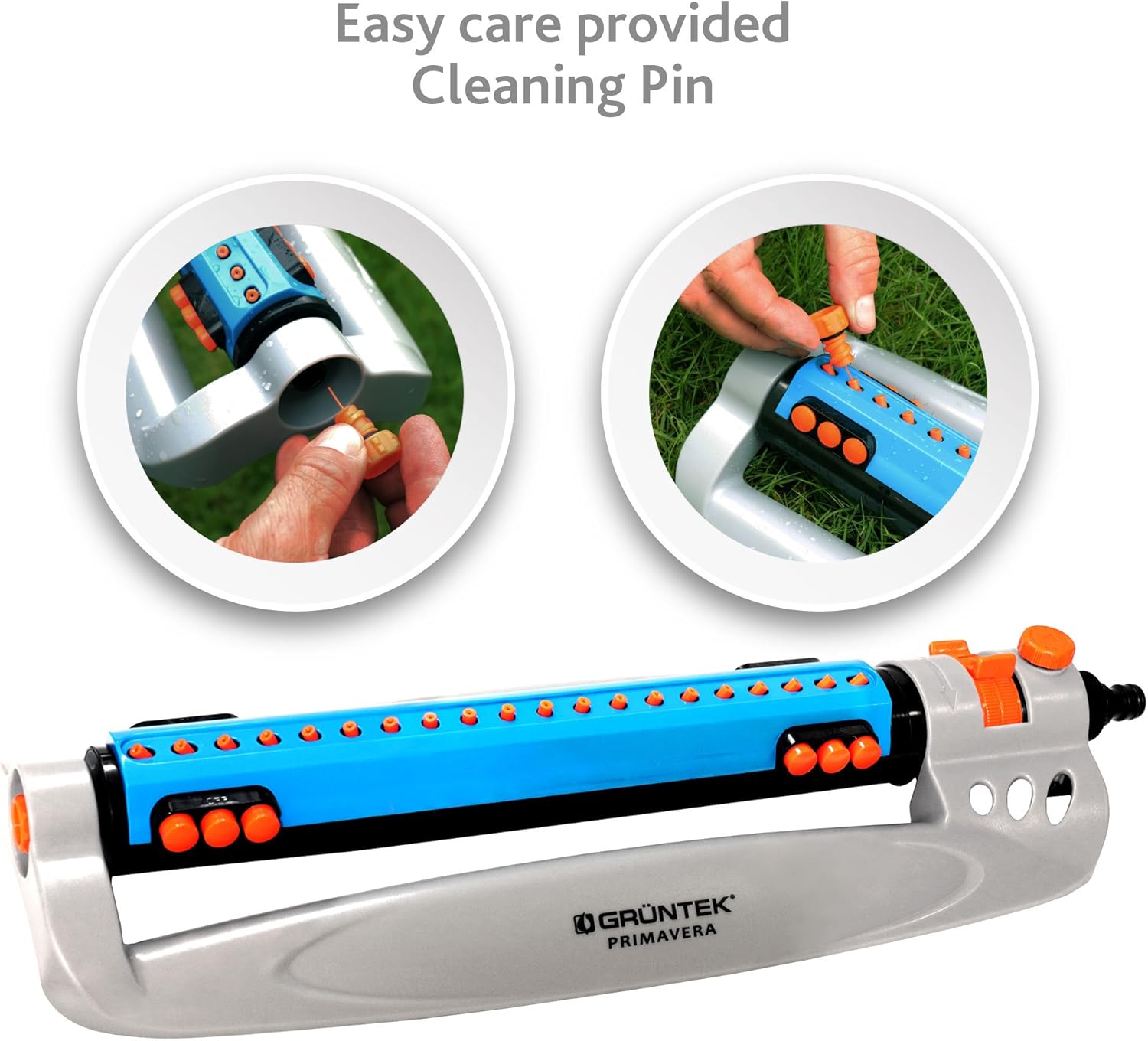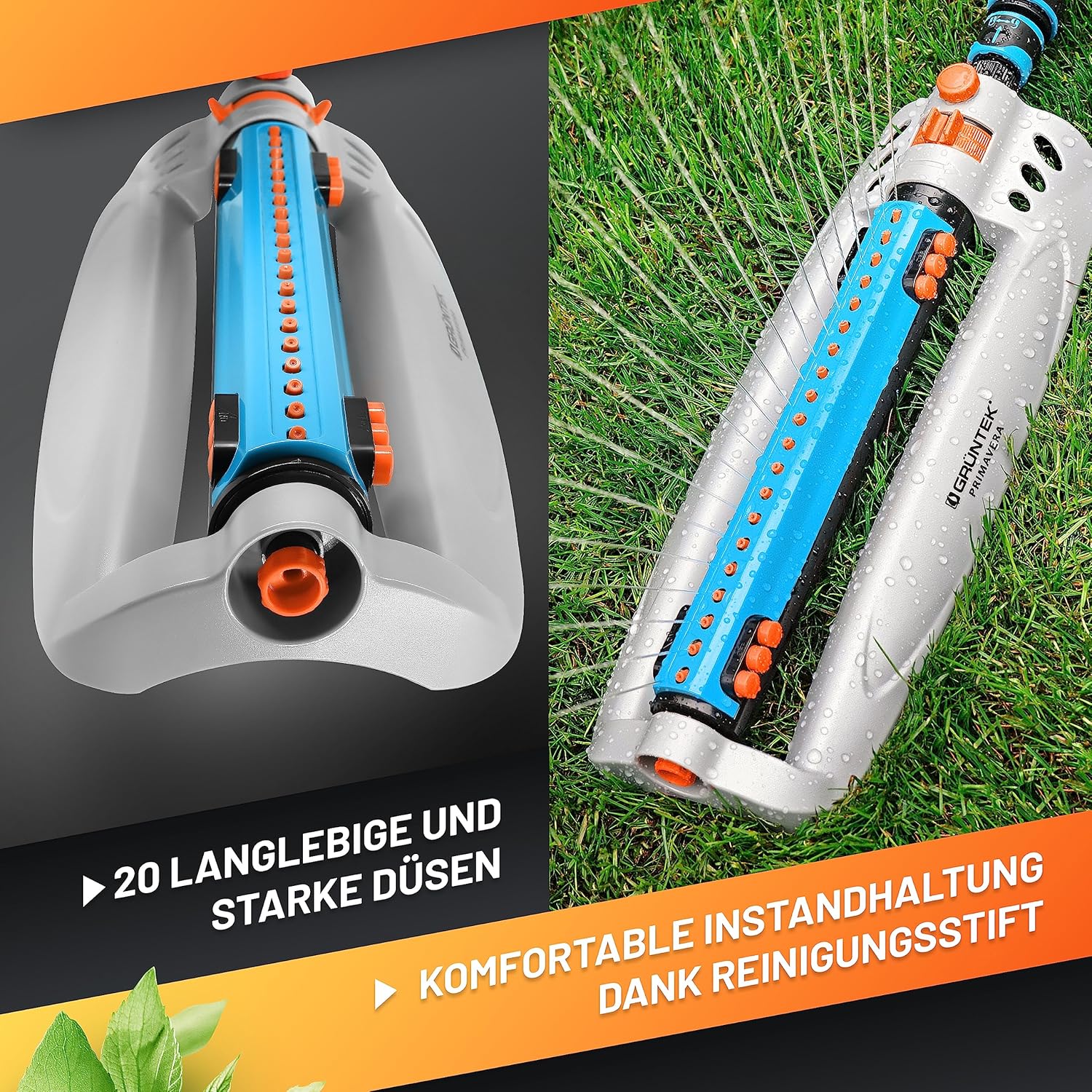 • Rasensprenger mit 20 Düsen mit einfacher Anpassung und praktischem Düsen-Cleaning-Plug; Aus recyclebarem und besonders stossfestem ABS-Kunststoff