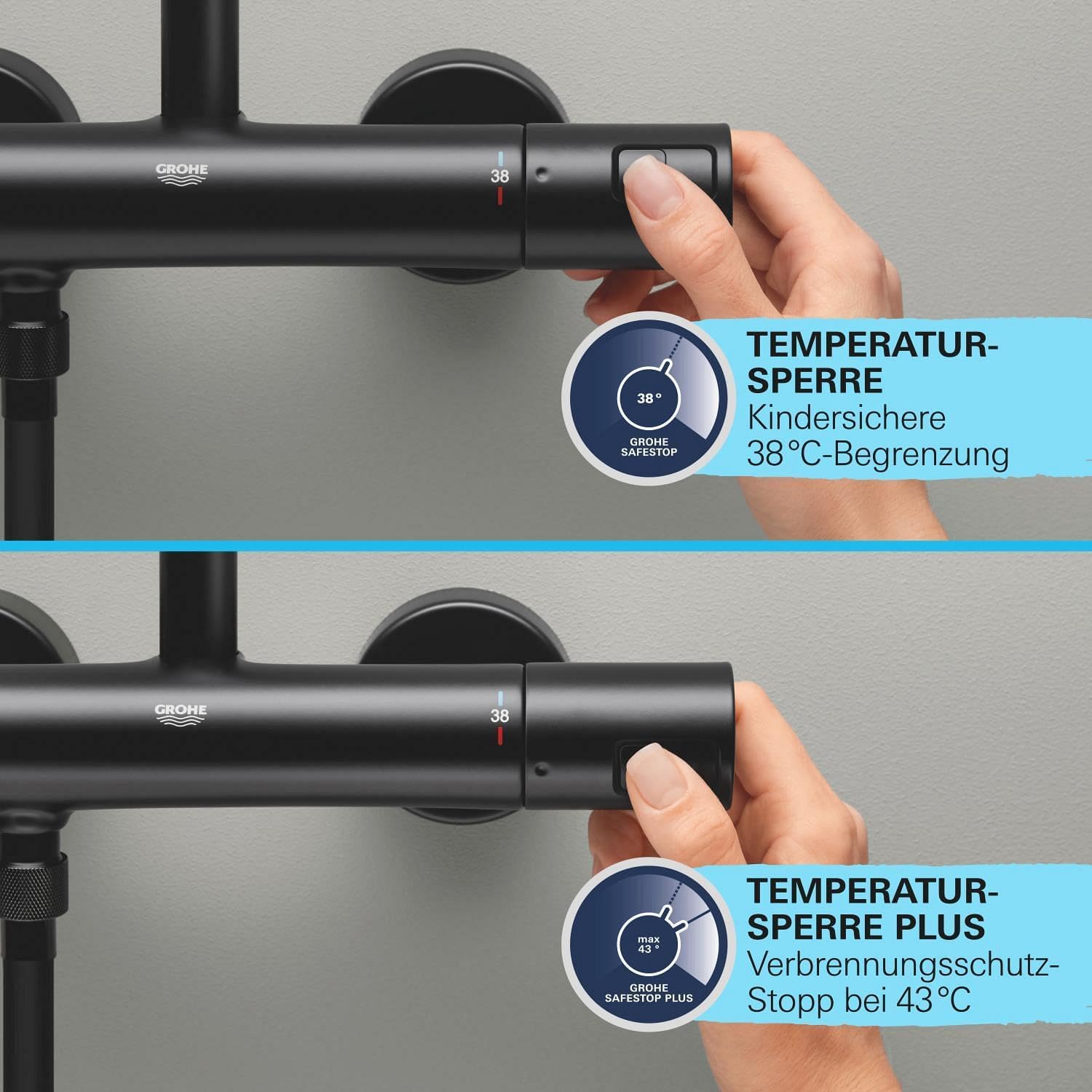 - Die schlanke und elegante GROHE Precision Start Thermostat-Duscharmatur in stilvollem Mattschwarz – mehr Sicherheit und Komfort für Ihr Bad