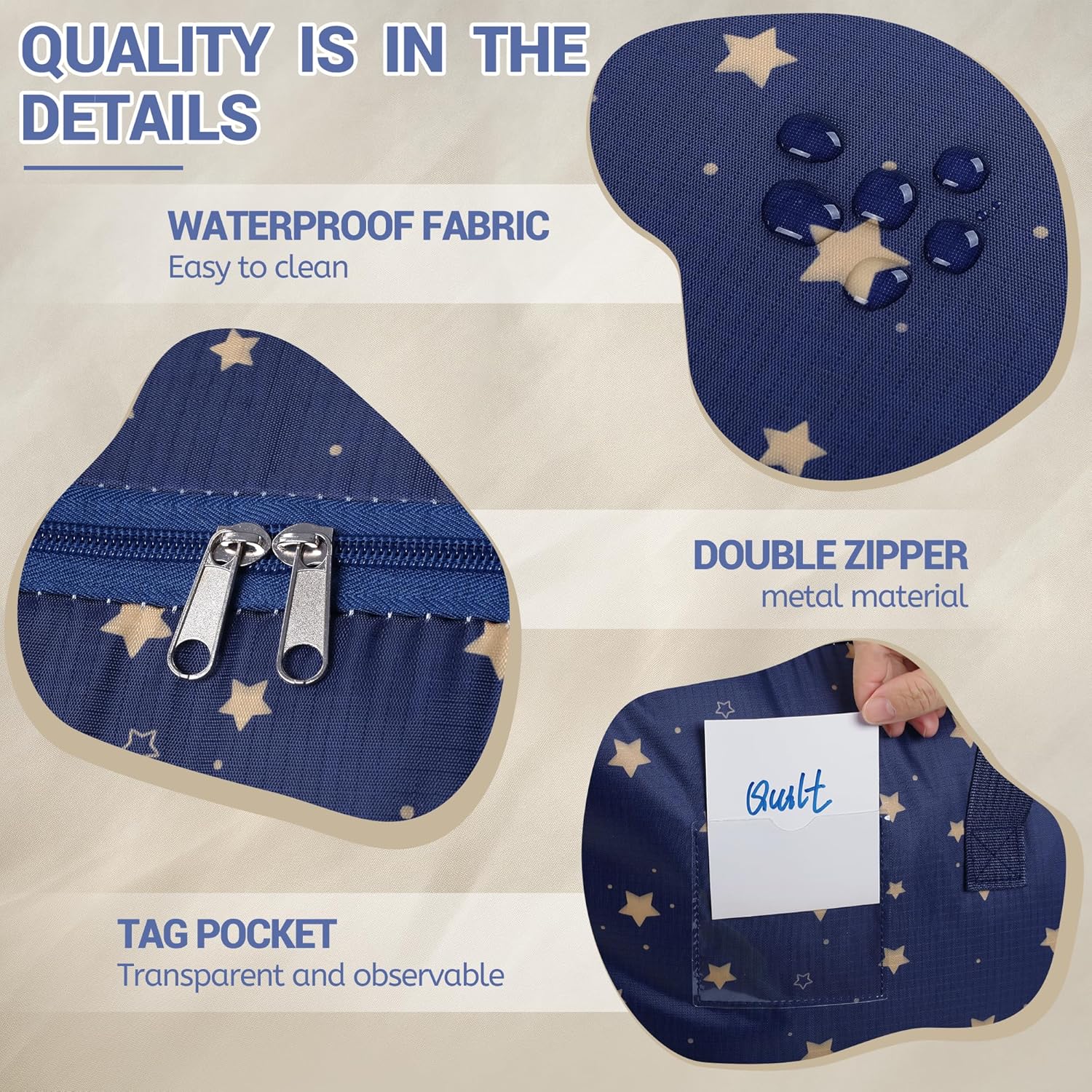 - Langlebige Umzugstaschen: Wir verstärken die Griffe und den Reissverschluss, sodass die Aufbewahrungstasche über 70 Pfund Gewicht standhält, wodurch sie robuster und langlebiger ist, um verschiedene Herausforderungen zu bewältigen
