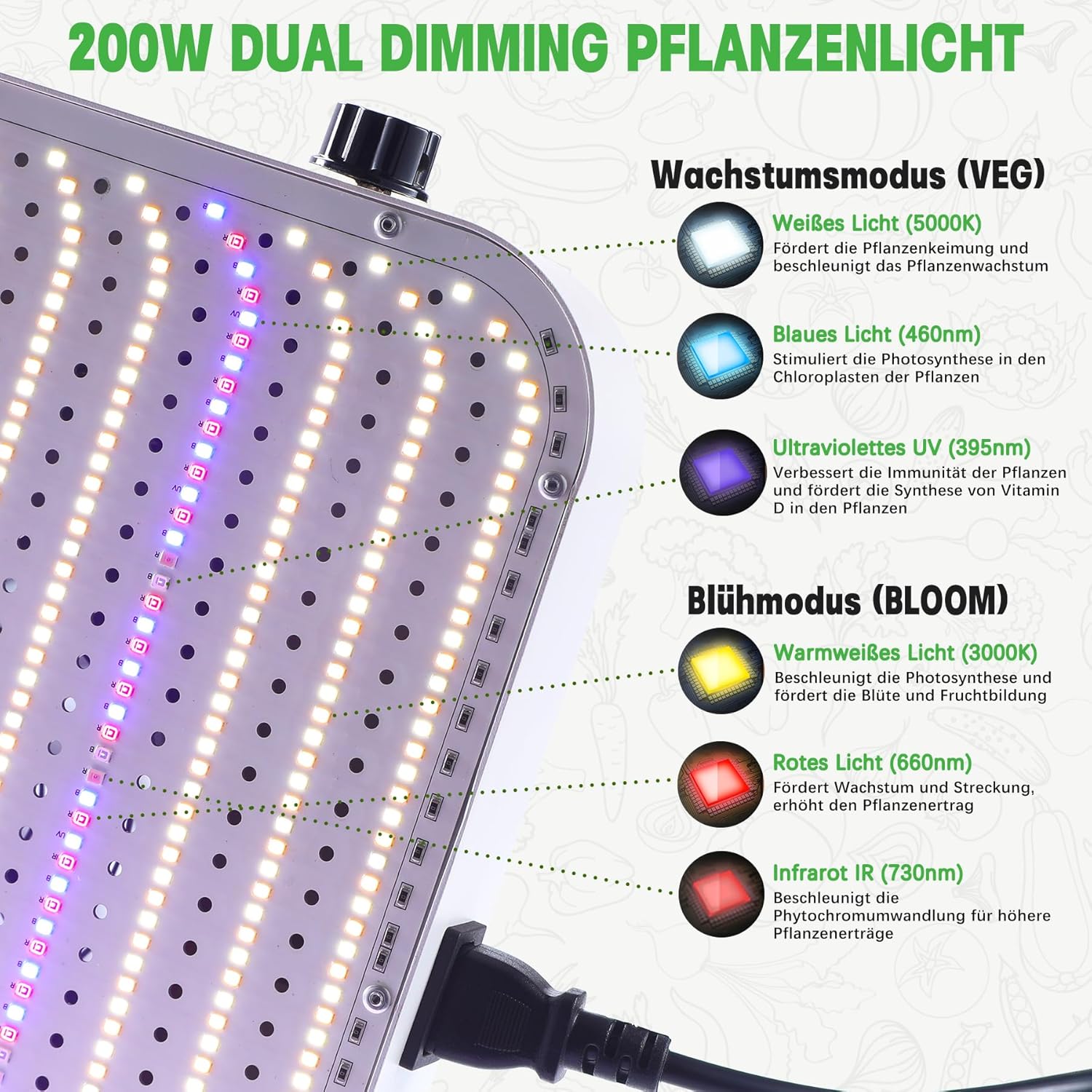 - 【200W Dual Dimmable Plant Light】LED pflanzenlampe, das volle Spektrum des 200W Pflanzenlichts (460-660nm, 3000-5000K, 395-730nm) ist perfekt für das Pflanzenwachstum und die Blüte, um jede Phase des Pflanzenzyklus zu berücksichtigen. Die beiden