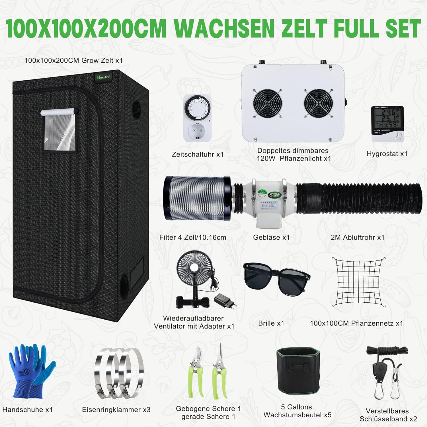 - 【Grow Zelt Komplettset】Grow zelt komplett set enthält ein zweifach dimmbares 200W Grow Licht (Edelstahl-Lanyard + Brille + Lederlineal + verstellbares Ratschenseil), ein 100x100x200cm Grow-Zelt, einen 6„-Lüfter mit Adapter, einen
