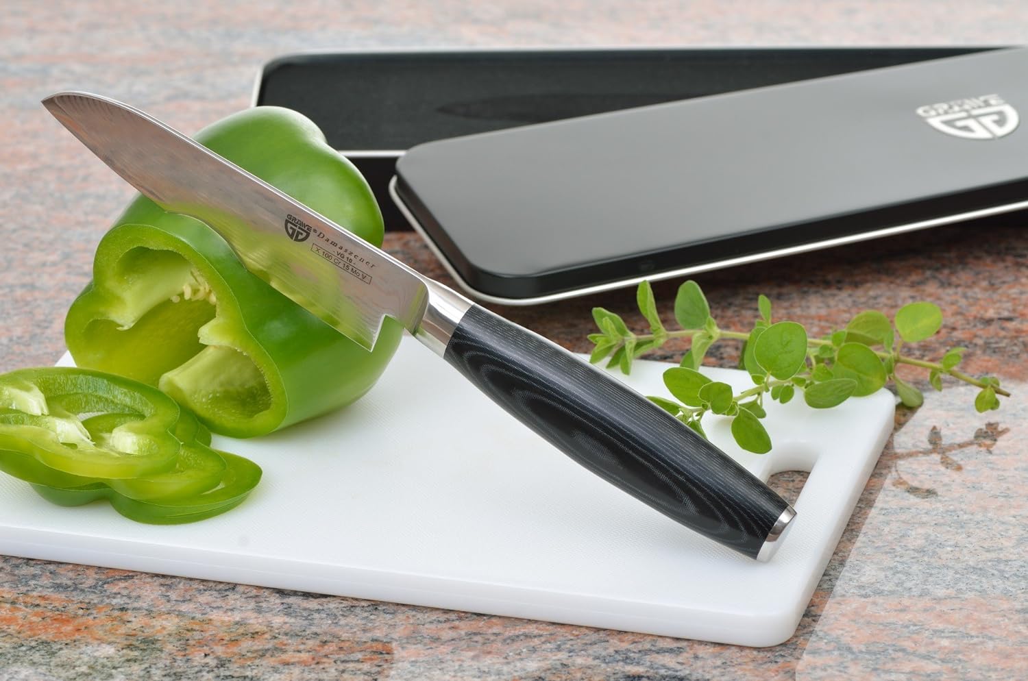GRÄWE Damaszener Santokumesser 12 cm - Damast-Küchenmesser mit 65-lagiger Klinge und Micarta-Griff,