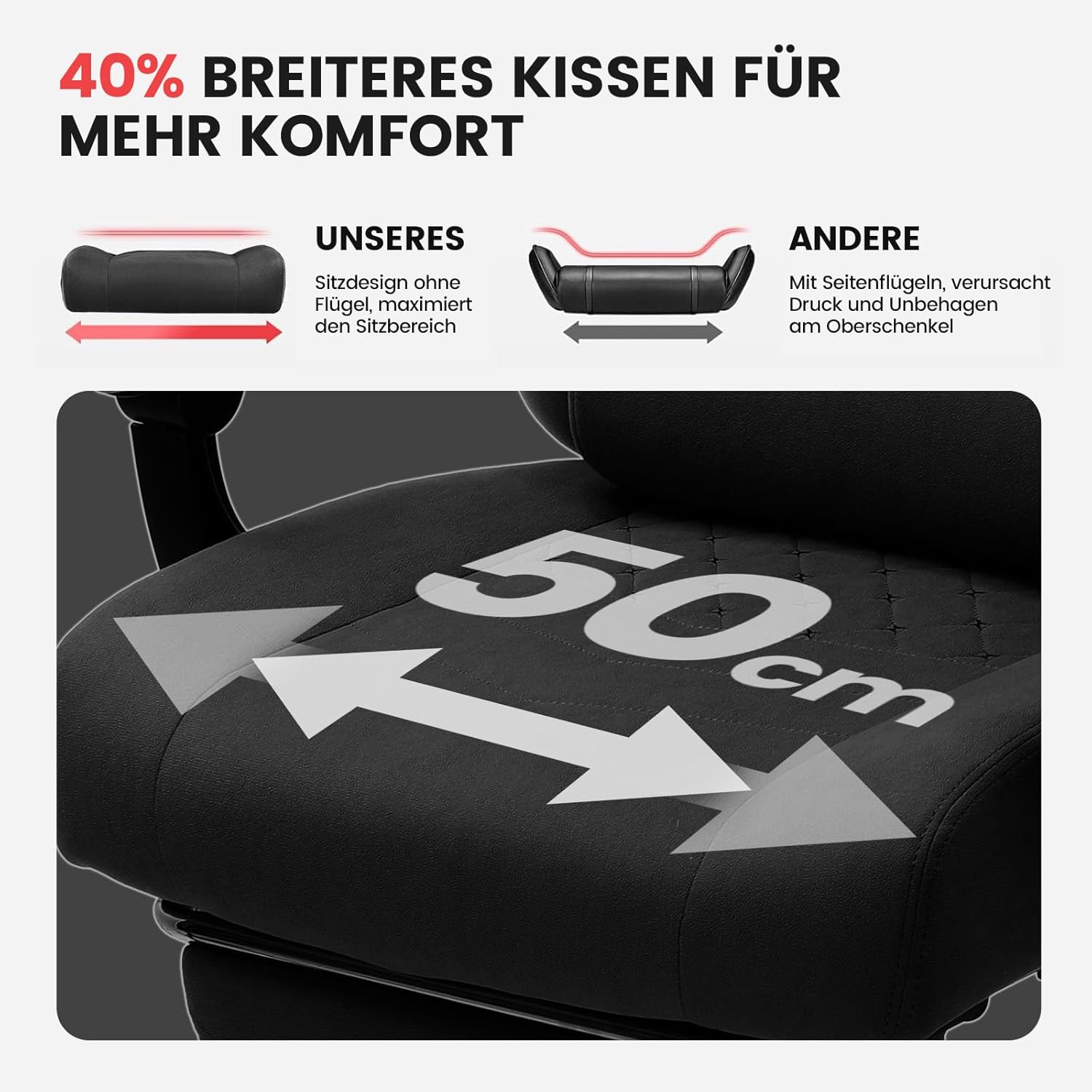 - verteilt Druck gleichmässig und bietet sofaähnlichen Komfort. Die 51 cm breite Sitzfläche ermöglicht freie Bewegung – ob gekreuzte Beine oder dynamische Drehungen. The seat and frame of the gaming chair are made of FSC-Certified wood.