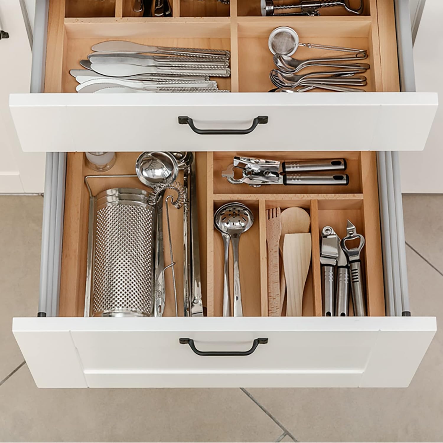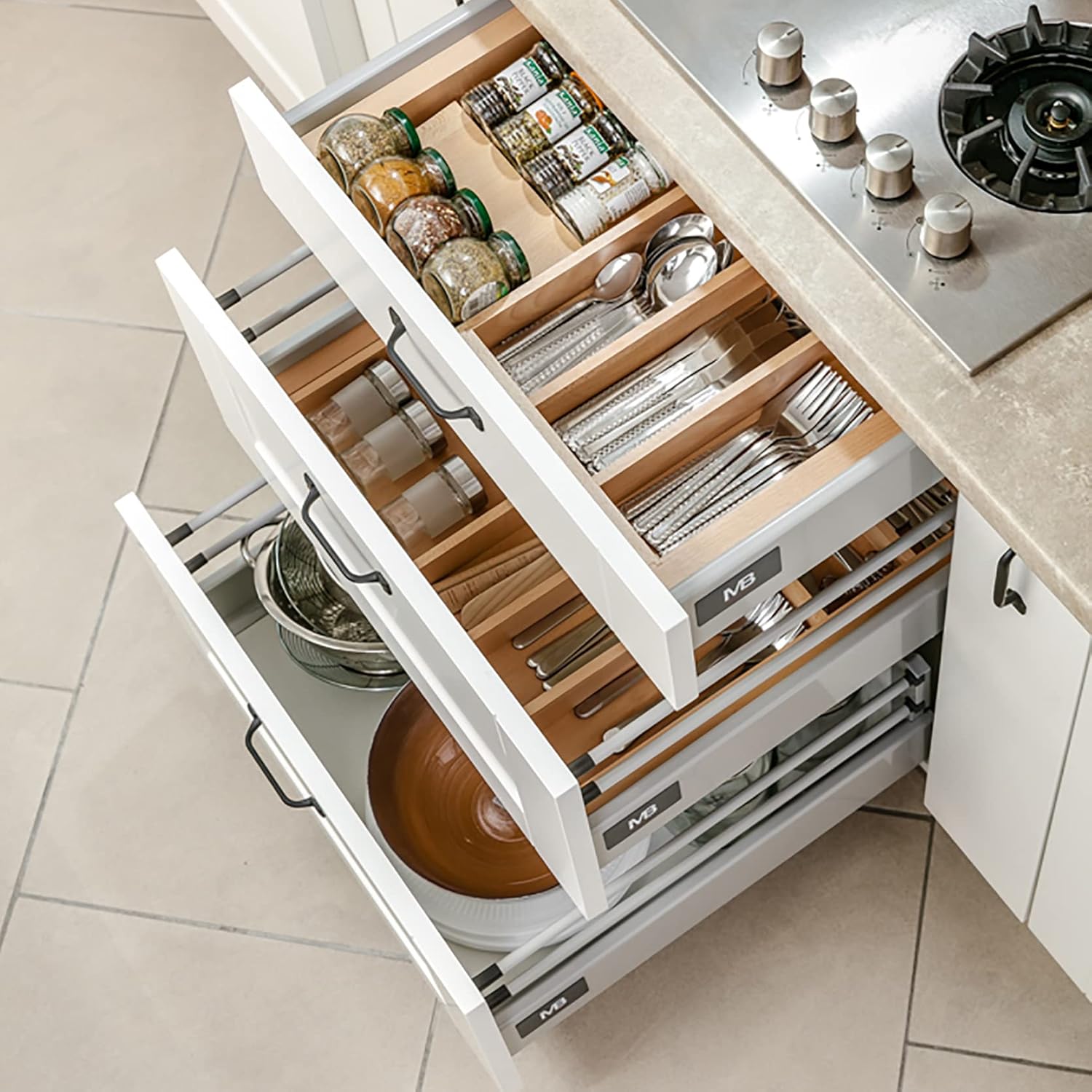 - Das System verfügt über verschiedene Anordnungsoptionen und ermöglicht es Ihnen, den verfügbaren Raum optimal zu nutzen. Die Schubladen können selbst dort wo wenig Platz zur Verfügung steht, wie unter dem Ofen, genutzt werden. Des Weiteren können