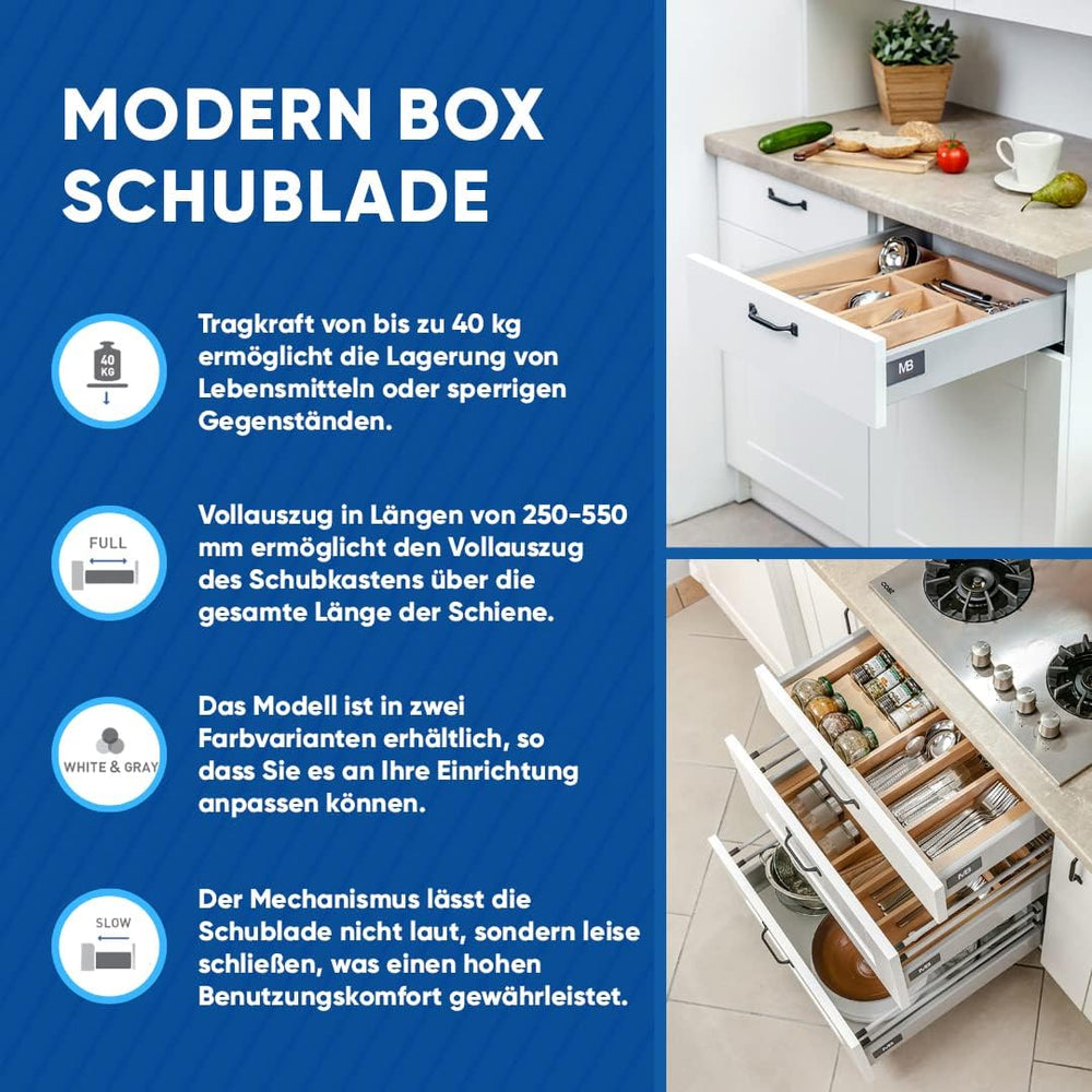 - Die Schubladensysteme Modern Box zeigen ihr volles Potenzial, wenn auf Gegenstände und Produkte im hinteren Teil der Schublade zugegriffen werden muss. Der Vollauszug ohne lästigen Auszugsverlust tragt enorm zur Benutzerfreundlichkeit bei und sorgt