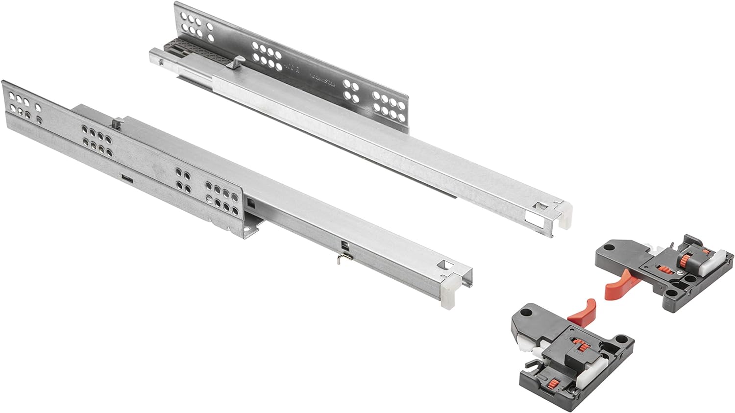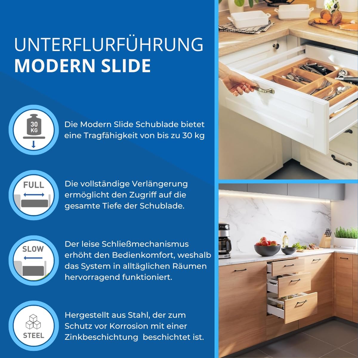 - Die Führungen sind universell einsetzbar und können daher in Möbeln für verschiedene Räume verwendet werden. Sie ermöglichen den Bau von Standard- und internen Schubladen, wobei letztere in Küchen und Bädern immer beliebter werden. Mit dem Modell