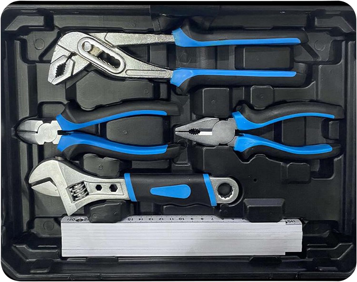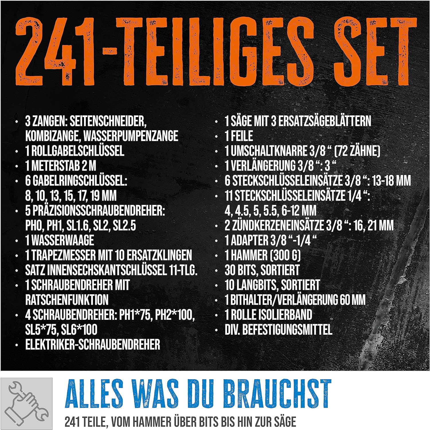 - Das Werkzeug-Set besteht aus Zangen für jeden Einsatz, Schraubendrehern, Wasserwaage, Hammer, Steckschlüsseleinsätze und vieles mehr.