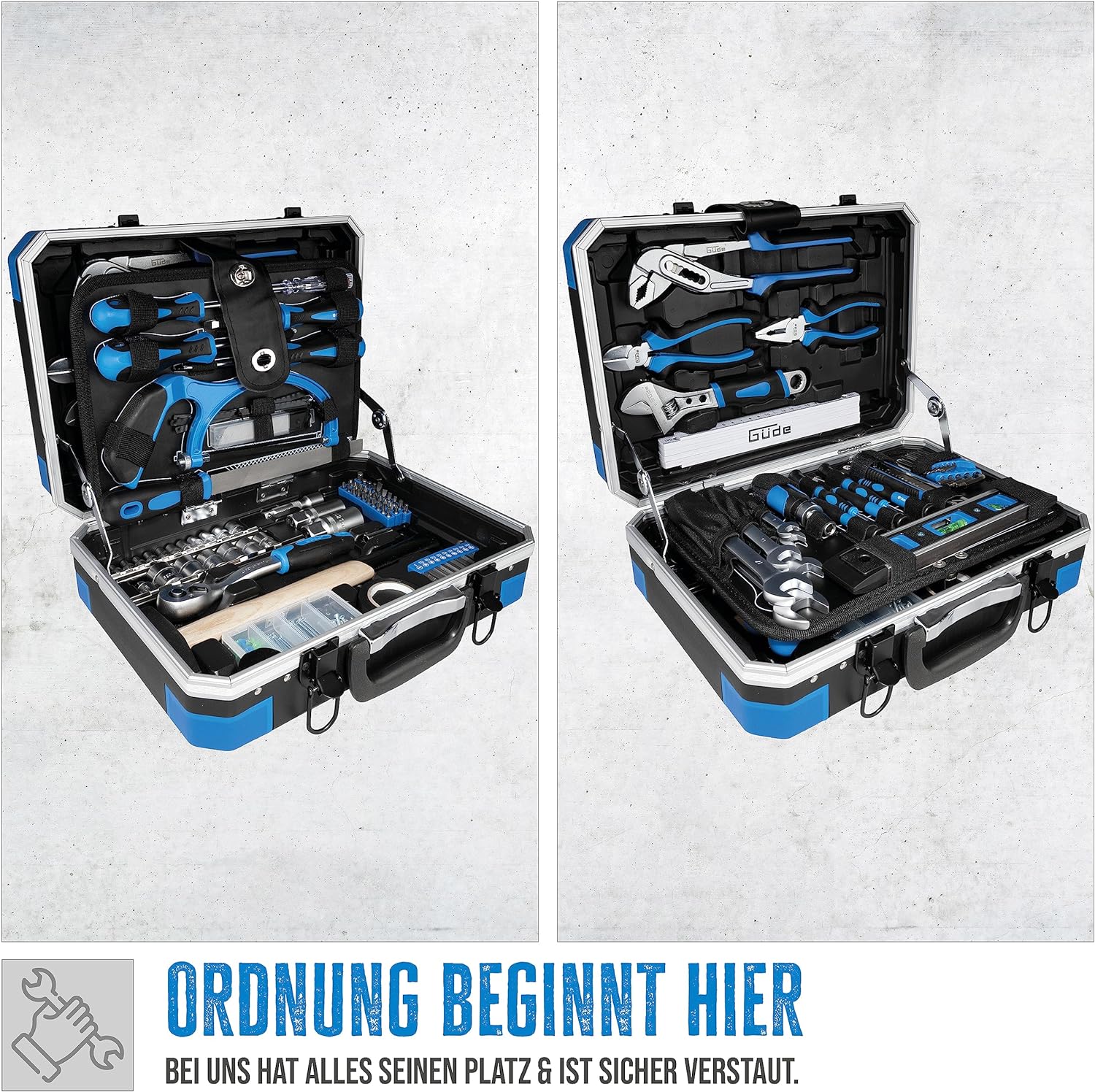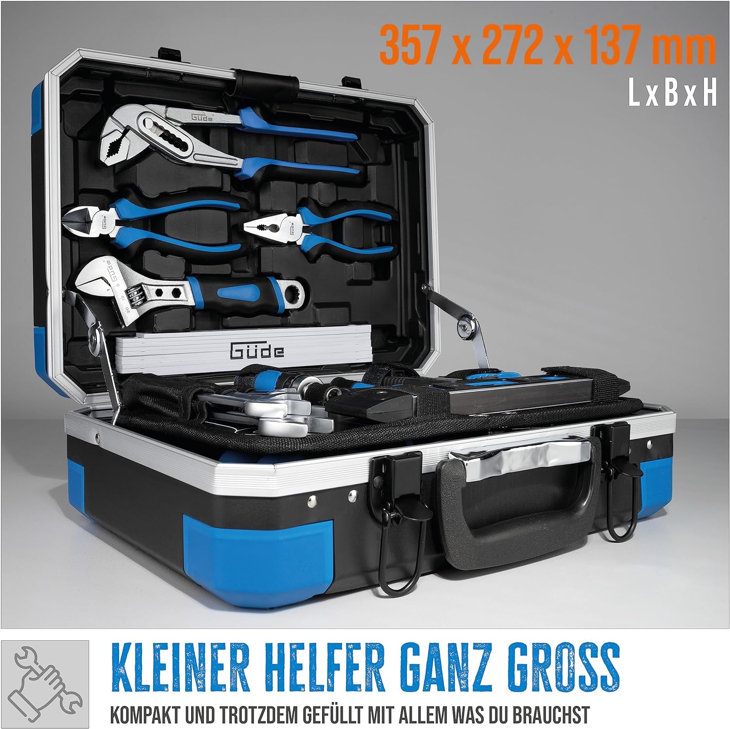 - Der Güde Werkzeugkoffer ist die perfekte Grundausstattung für Jedermann. Der Koffer enthält alles, was Sie für einfache Heimwerkerarbeiten und Haushaltsreparaturen benötigen.
