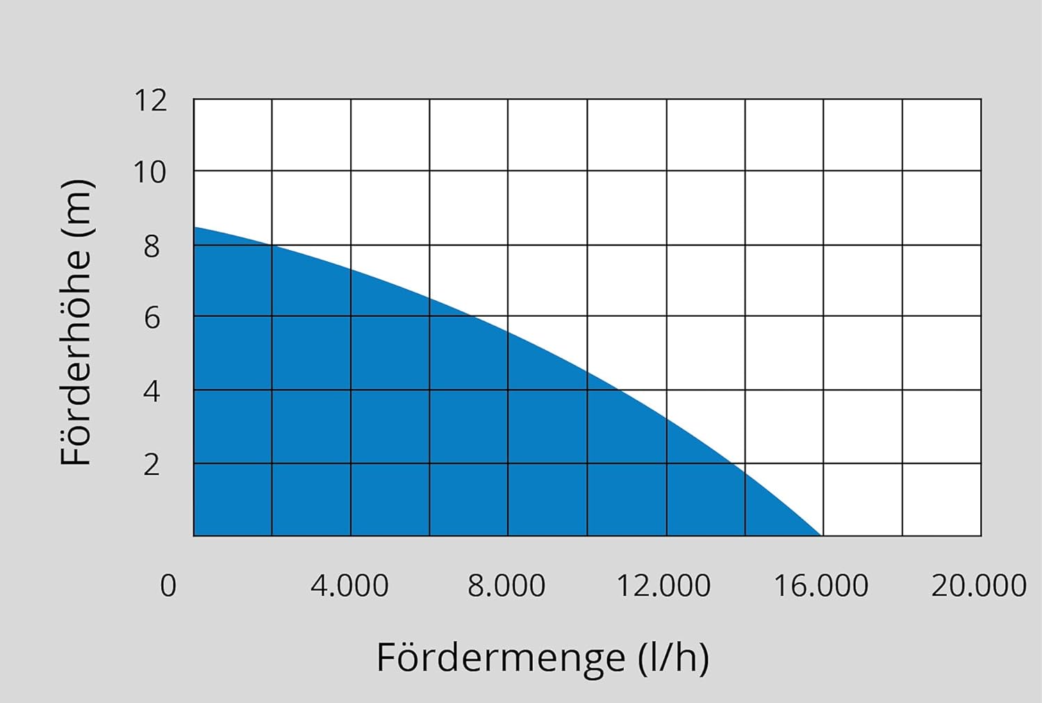 - Fördervolumen bis zu 15900 l/h, max. Förderhöhe : 8,5 m, max. Eintauchtiefe : 7 m