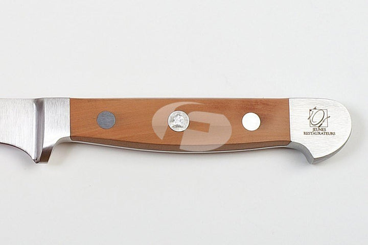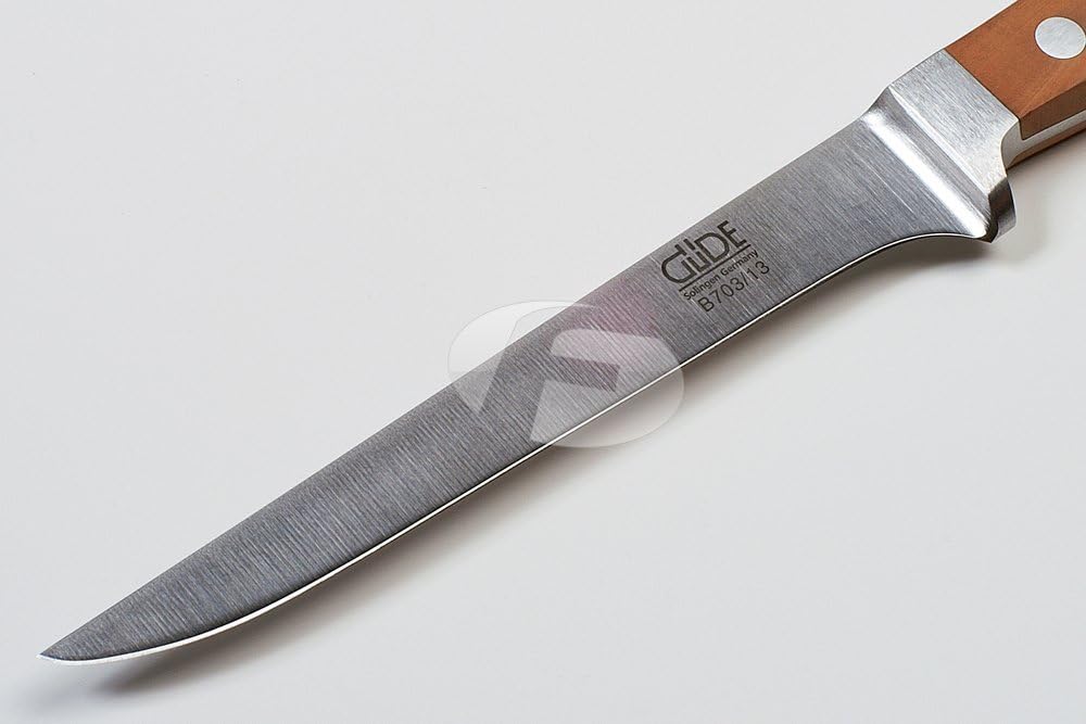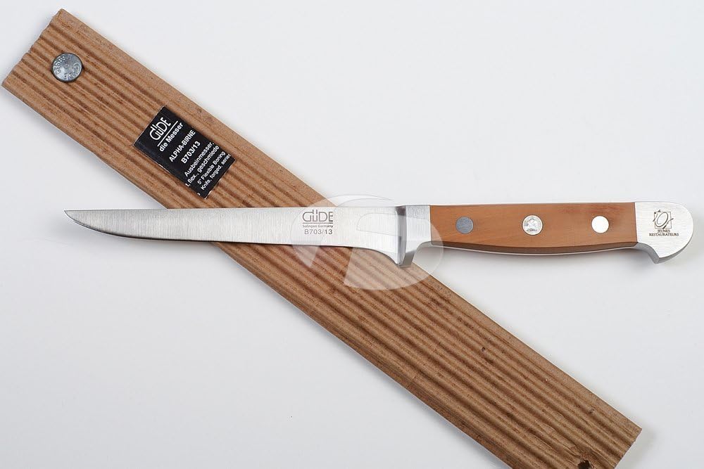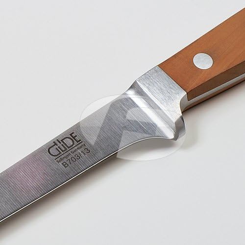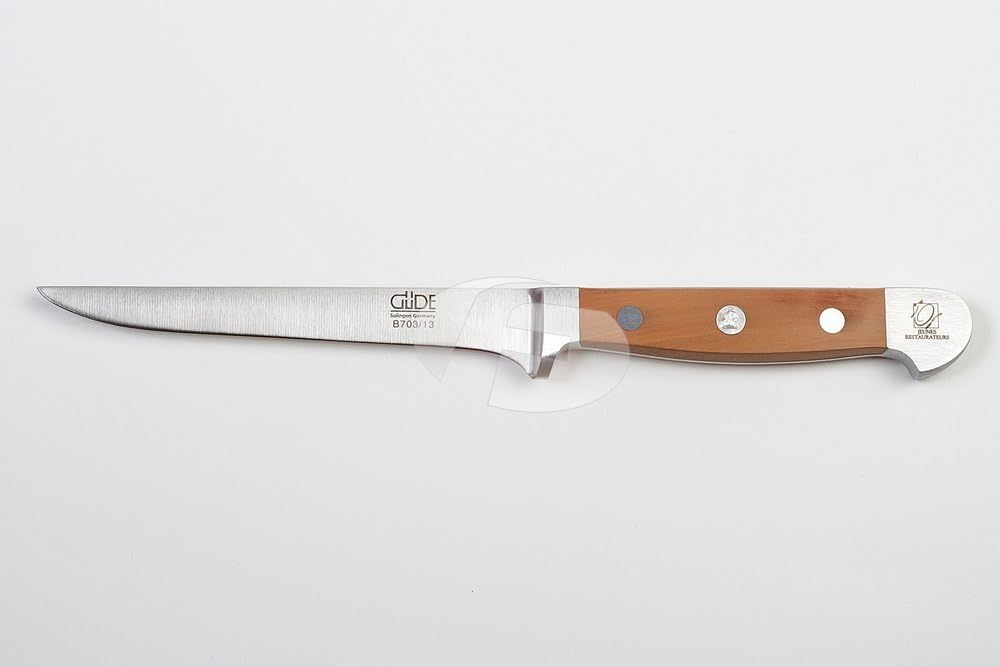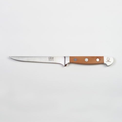 PRODUKTBESCHREIBUNGEN Franz Güde flexibles Ausbeinmesser der Serie Alpha Birne Güde. Handwerk mit Zukunft. Viele Köche verderben den Brei: stimmt nicht! Ausgezeichnete, wie die der Köchevereinigung Jeunus Restaurateurs d'Europe, bilden die perfekte Liaison von Talent und Passion. Sonst würde der französische Champangerbotschafter Francois Poncet, nicht gesagt haben: "Was die Kochkunst angeht, so kann Gott heute auch getrost in Deutschland leben." Aus einem Stück in über 40 Arbeitsgängen von Hand geschmiedete Klinge ist versehen mit einem fein strukturiertem, samtigen Birnenholzgriff. Diese hochwertige Serie wurde zum Dank für die Aufnahme in den Kreis der Preffered Suppliers angefertigt. Ein Tipp zur Pflege: Hochwertige Messer sollten so gereinigt werden wie sie hergestellt werden, am Besten von Hand! Eigenschaften: * Klinge aus Chrom-Vanadium-Molybdän | rostfrei | eisgehärtet | handgeschärft * Griff ist optimal ausbalanciert.