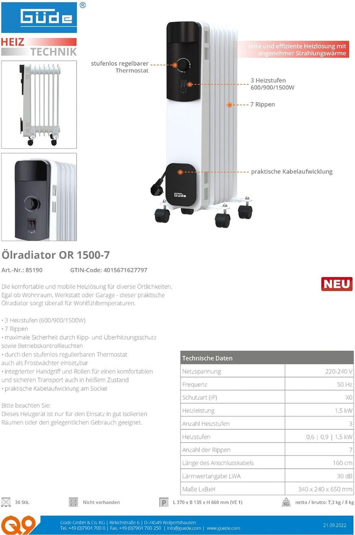 - MOBILE WÄRME: Der Güde Ölradiator OR 1500-7 ist Ihre komfortable und mobile Heizlösung, ideal für Wohnräume, Werkstätten oder Garagen, und sorgt überall für angenehme Wohlfühltemperaturen.