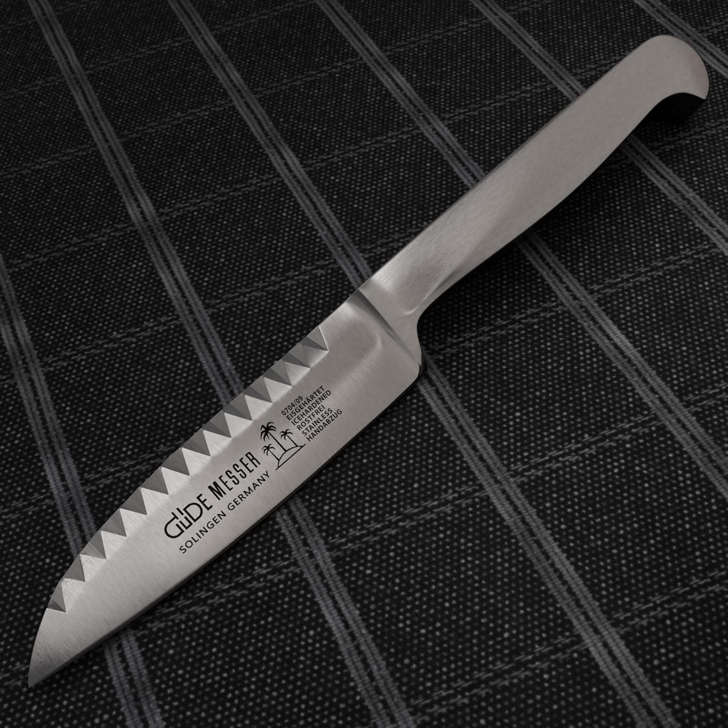 - Die 9 cm lange Klinge möchte regelmässig mit einem Wetzstahl, Stein oder anderem Schärfewerkzeug aufgerichtet werden. Spülen Sie das Messer mit warmen Wasser nach jeder Anwendung ab und trocknen Sie es mit einem Leinentuch. Das Messer dankt Ihnen