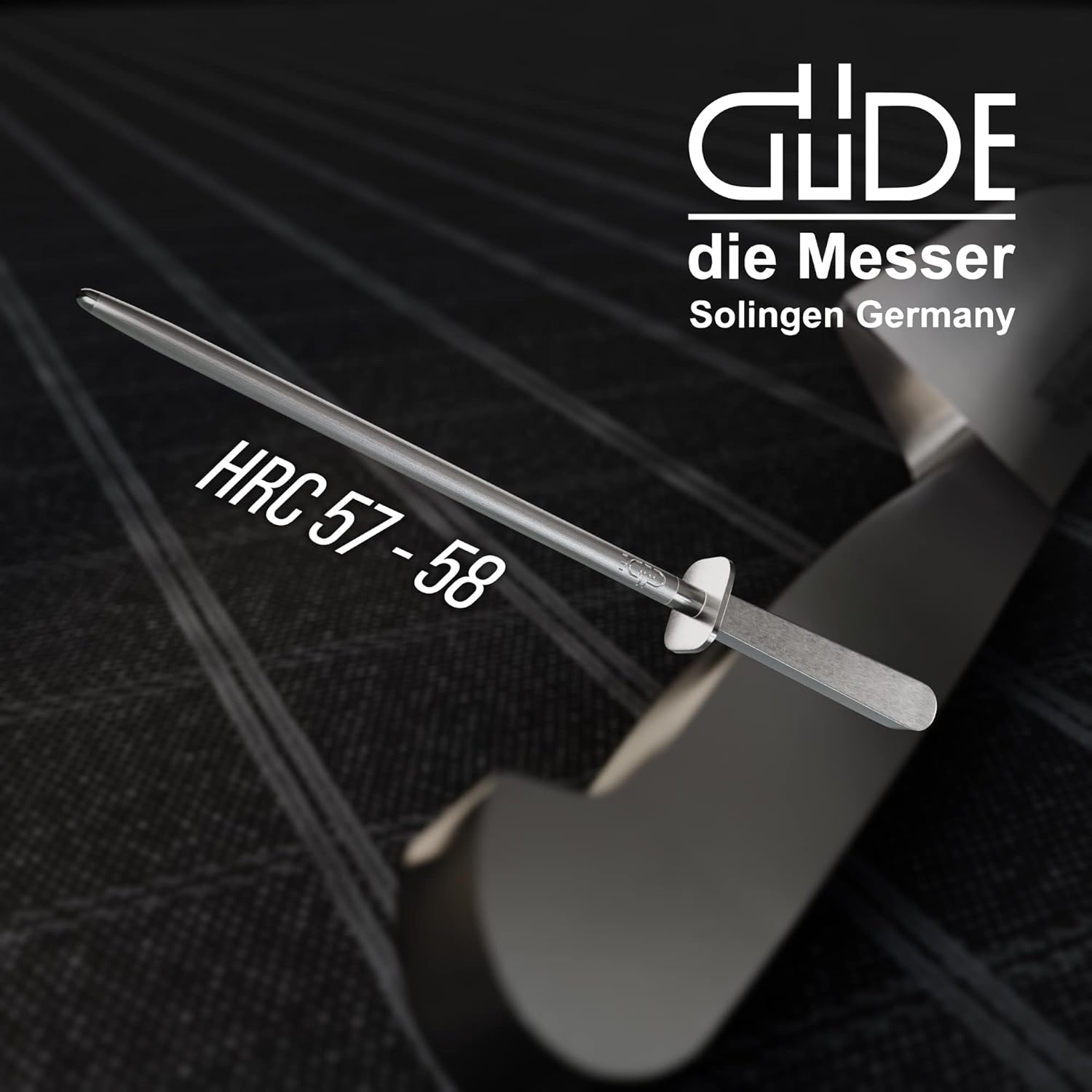 - Als einer der letzten deutschen Messerhersteller setzt GÜDE auf perfekte Handarbeit. Der Wetzstab ist aus legiertem Werkzeugstahl (Chrom-Vanadium), rostfrei und hartverchromt.