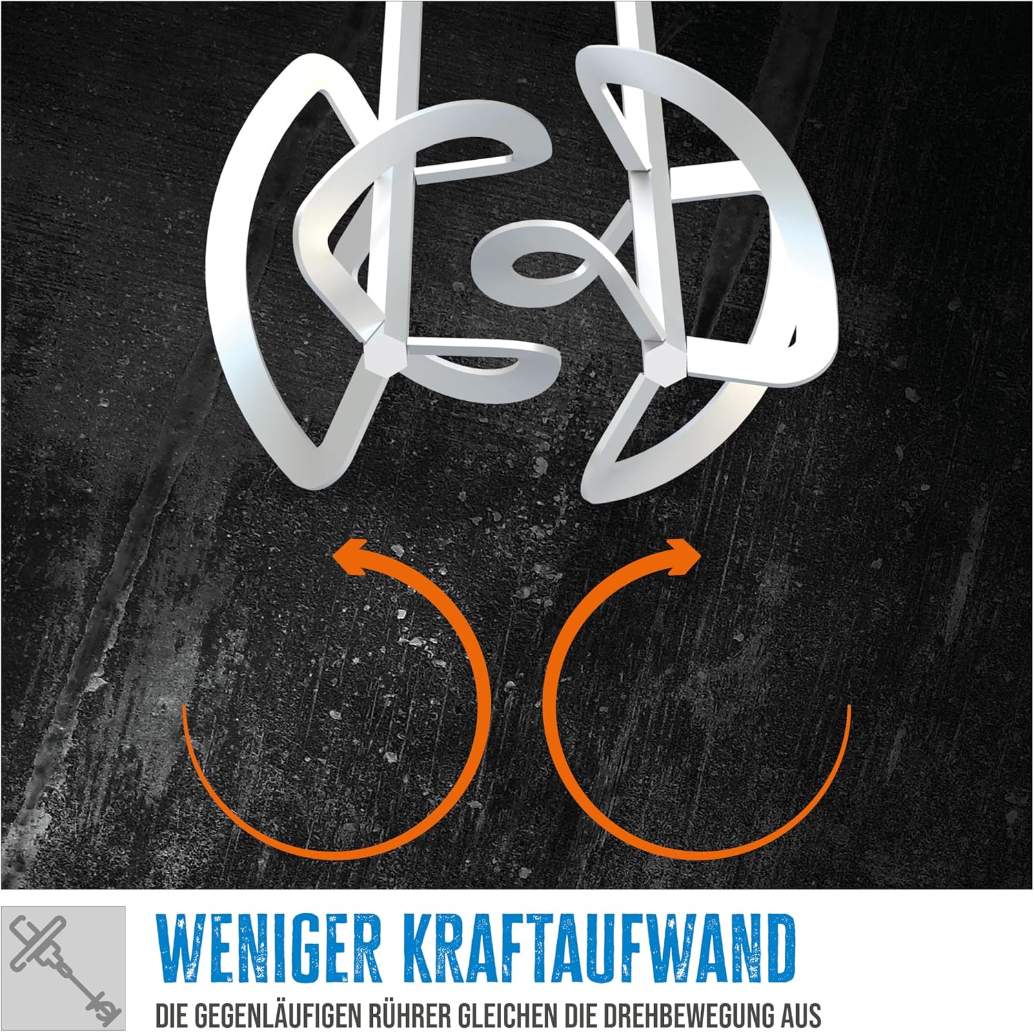 - Geringer Kraftaufwand und effektive Rührbewegungen: Durch die gegenläufigen Rührer werden Drehbewegungen effektiv ausgeglichen, was zu einem geringeren Kraftaufwand für den Benutzer führt. Dadurch ist das Rührwerk auch bei längeren Arbeitszeiten