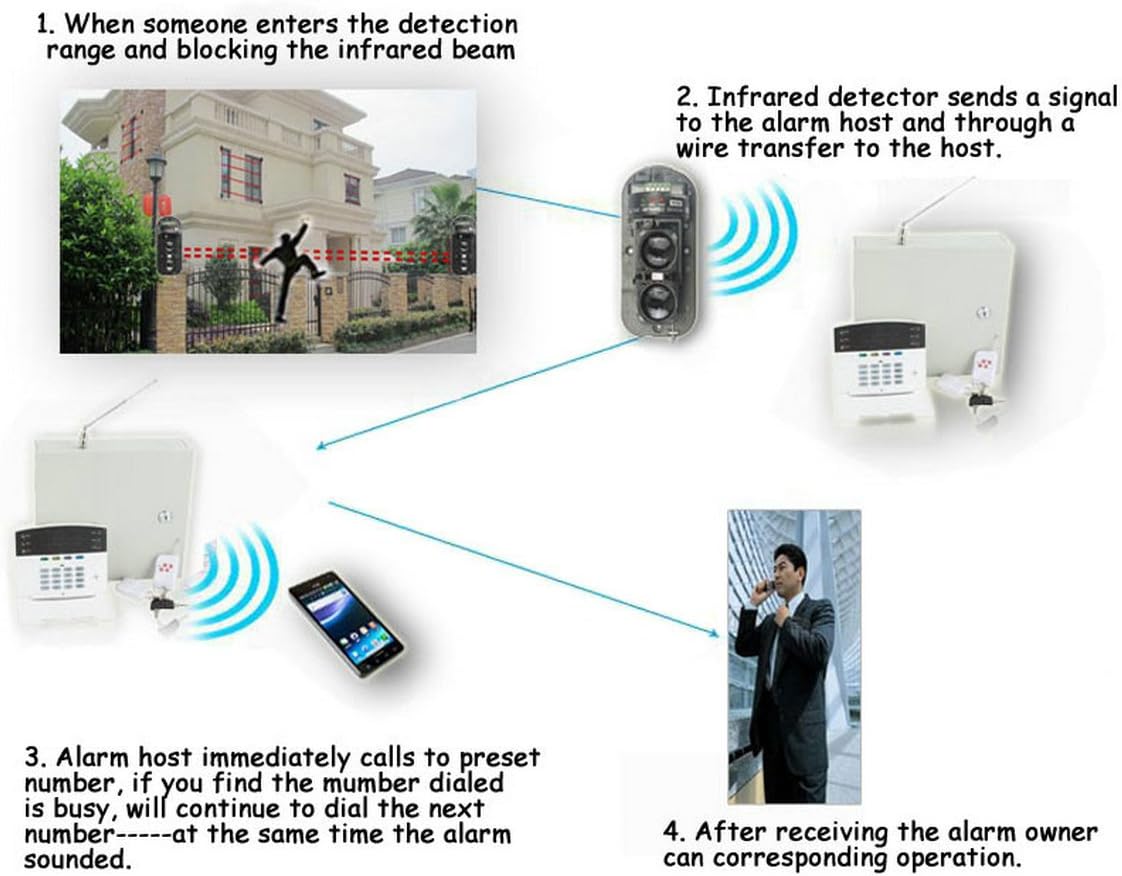 - Dies ist der fotoelektrische Zweistrahl-Infrarotdetektor ABT- 100m. Installieren Sie sie an den gegenüberliegenden Positionen. Dann gibt es einen Infrarotbereich zwischen diesen beiden Detektorteilen. Wenn jemand den Infrarotbereich innerhalb der