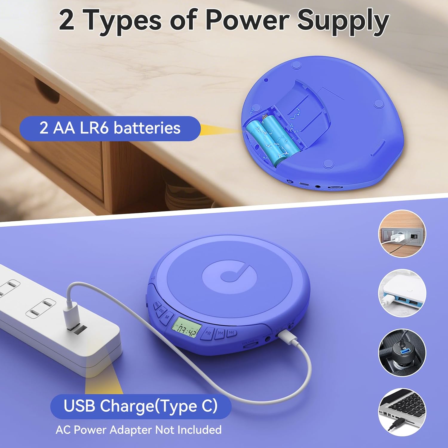 - [Stromversorgung] Zu Hause können Sie den CD-Player mit dem Typ-C-Kabel im Handumdrehen einwandfrei einstellen; Wenn Sie draussen sind, müssen Sie sich keine Sorgen um Stromquellen machen, da 2 x LR6 Batterien (NICHT INBEGRIFFEN); Wenn Sie es in Ihrem