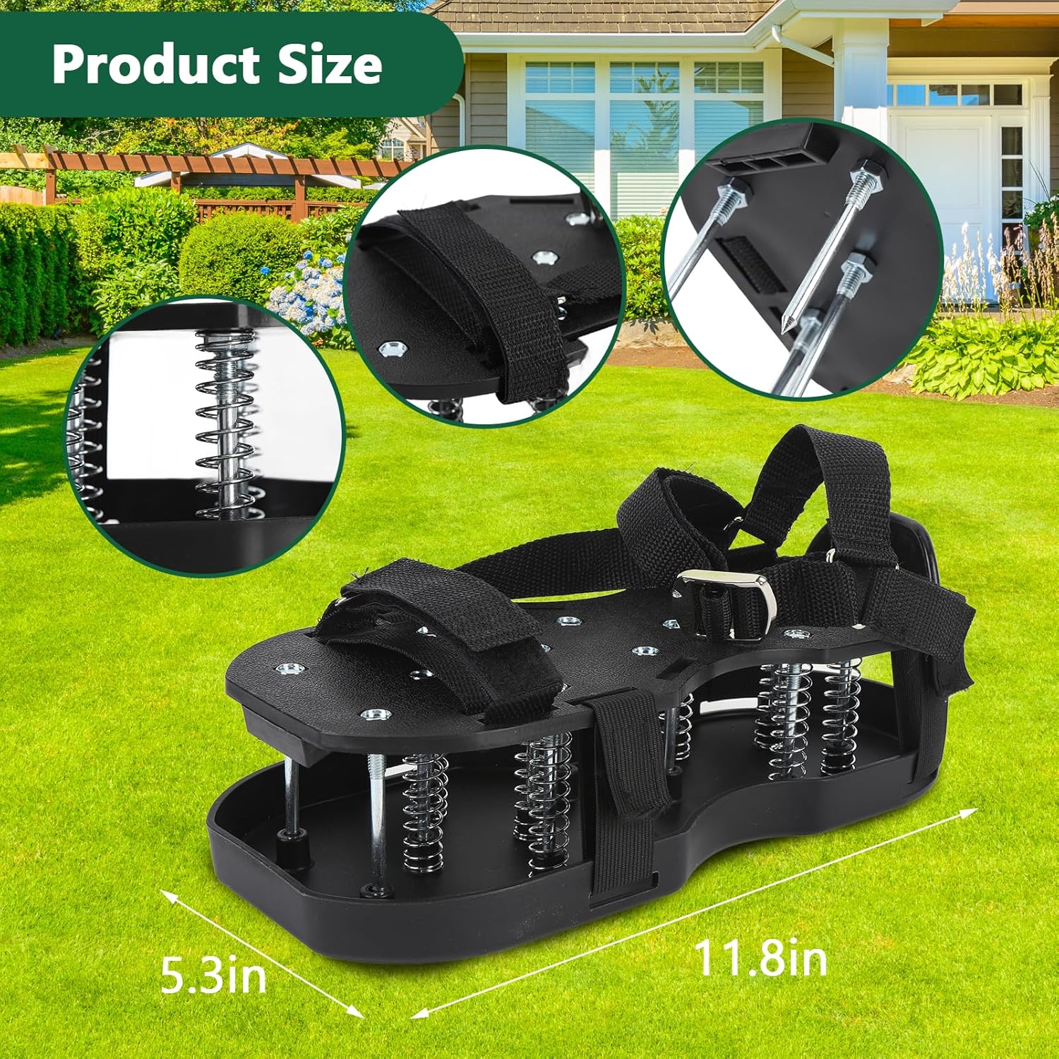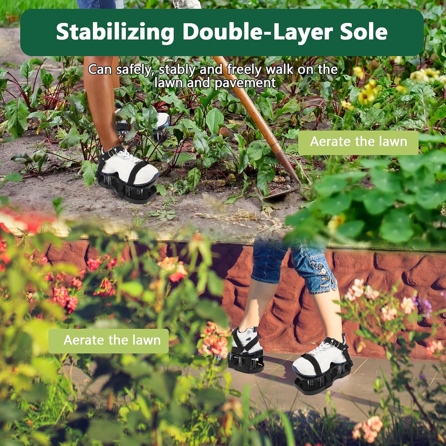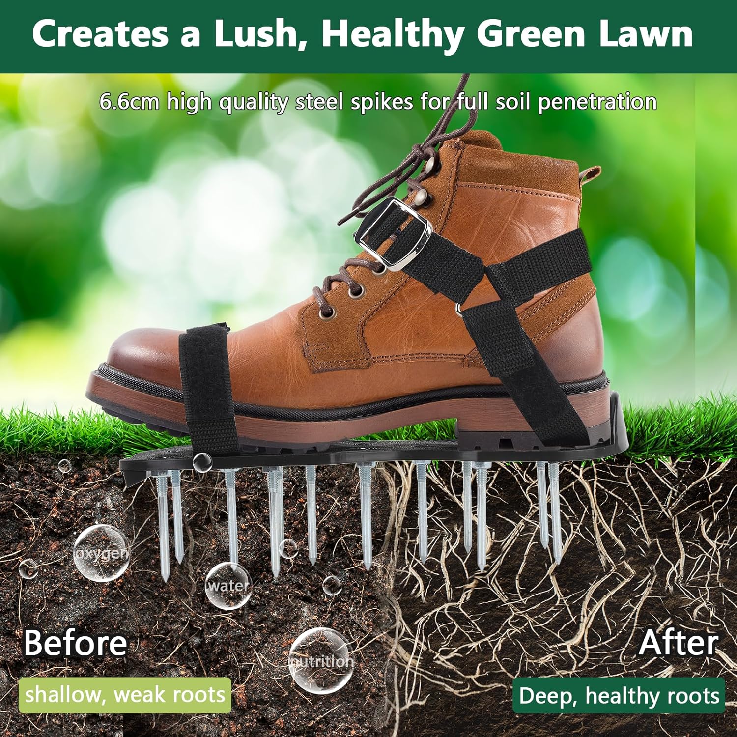- GRÜNES UND EFFIZIENTES WERKZEUG ZUR BODENLOCKERUNG: Verwenden sie diese rasenlüfter schuhe anstelle von teuren motorisierten lockerungsgeräten und aerifizierern, um eine umweltfreundlichere und grünere bodenlockerung auf ihrem rasen durchzuführen!