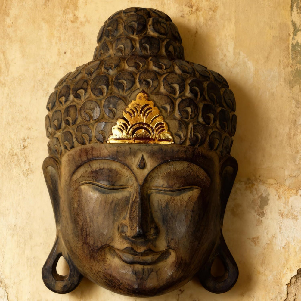 - Abmessungen: 50*27*12 cm, Schöne Buddha-Maske aus Balsaholz, dunkel lasiert, mit viel Charme und Goldverzierung