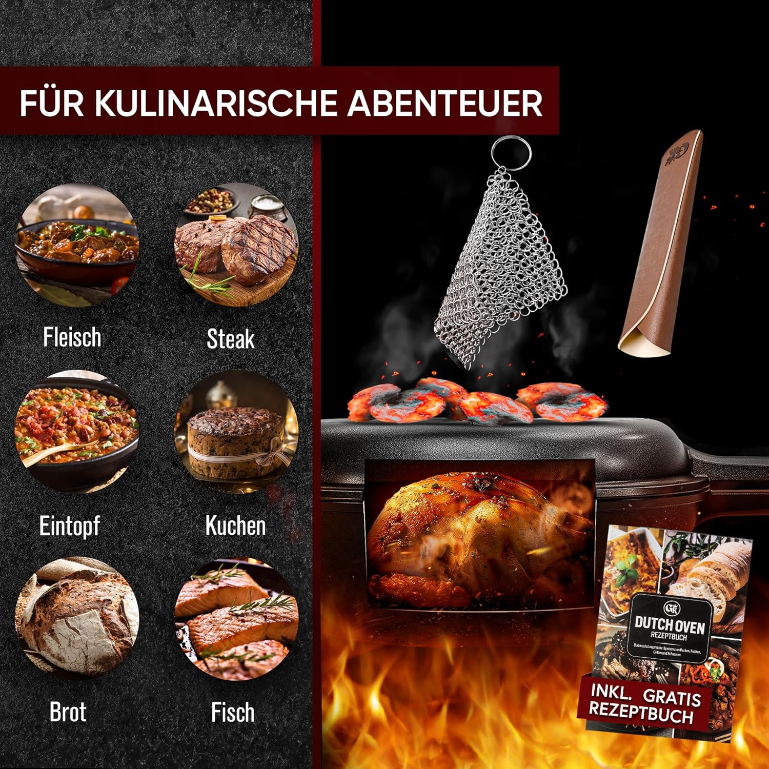 • 🔥DUTCH OVEN ZUBEHÖR - Unser umfangreiches Dutchoven Set hat folgendes zu bieten: Echtleder Griff zum Anheben des Deckels, Ringreiniger aus Edelstahl, ein Dutch Oven Rezeptbuch & eine Thermometerdurchführung ohne den Deckel anheben zu müssen!