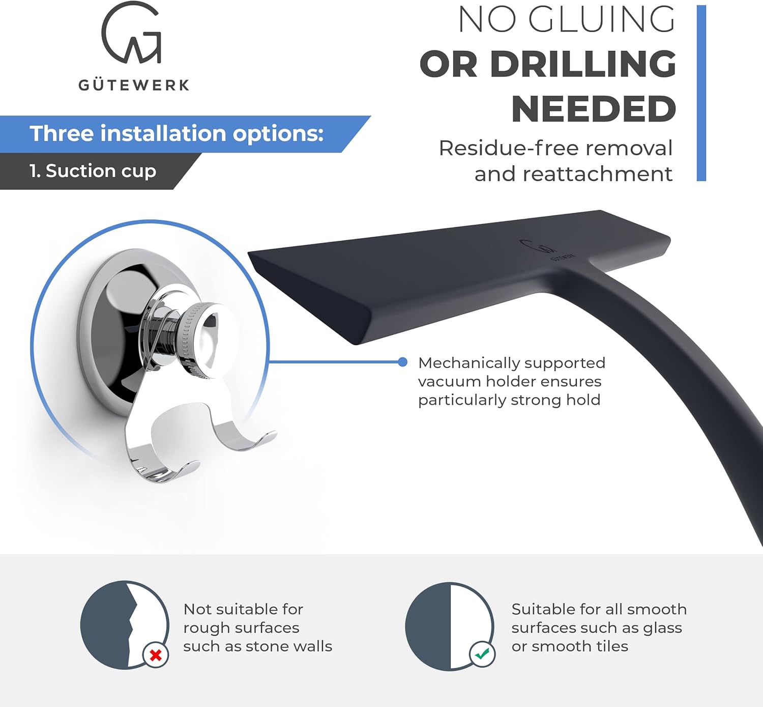 - INKLUSIVE HALTERUNG - Kein Bohren oder Kleben nötig. Einfaches Entfernen und Neuanbringen. Haken kann an glatten Flächen wie Scheiben, Fliesen, Duschwand, Duschglas, und Duschkabinen angebracht werden.
