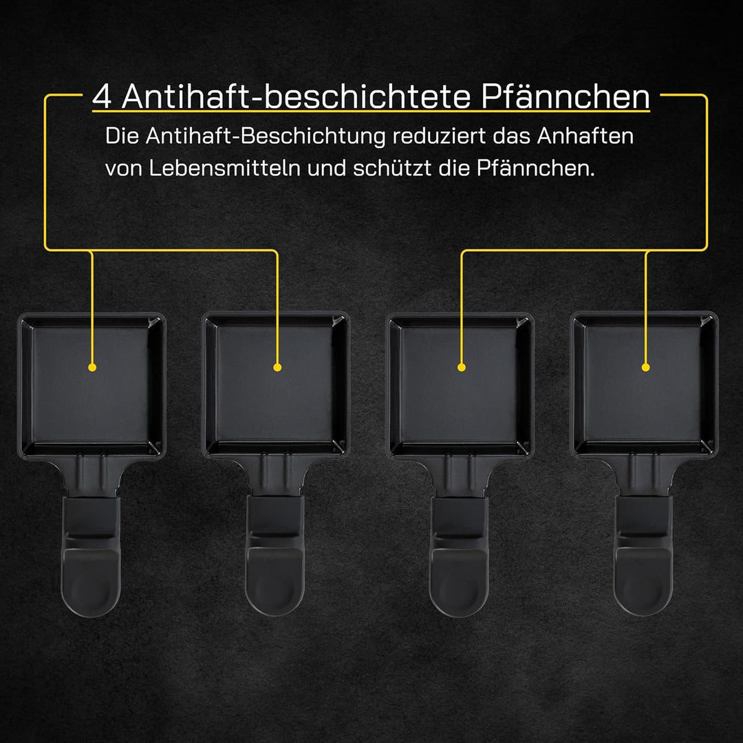 - Genug Platz: Das Gerät bietet mit seinen 4 Pfännchen genug Platz für einen gemütlichen Raclette-Genuss mit bis zu 4 Personen