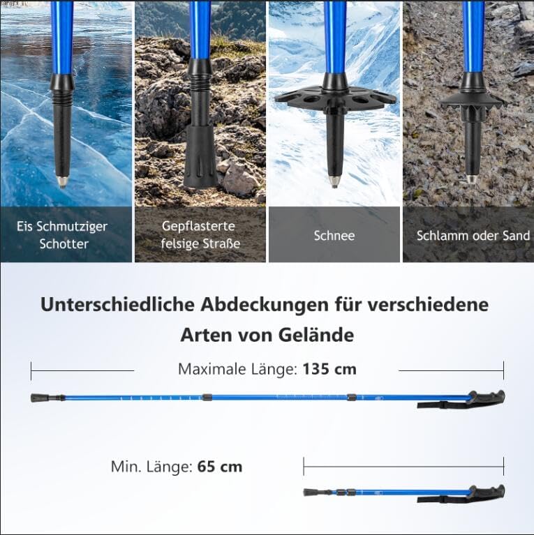 - ﹟ Verstellbare & stossdämpfende Trekkingstöcke ﹟ Die verstellbaren Trekkingstöcke (65 cm - 135 cm) mit stossdämpfenden Federn bieten einen komfortablen Griff. Die mitgelieferten Schnee- und Schlammbaskets passen zu verschiedenen Geländetypen.