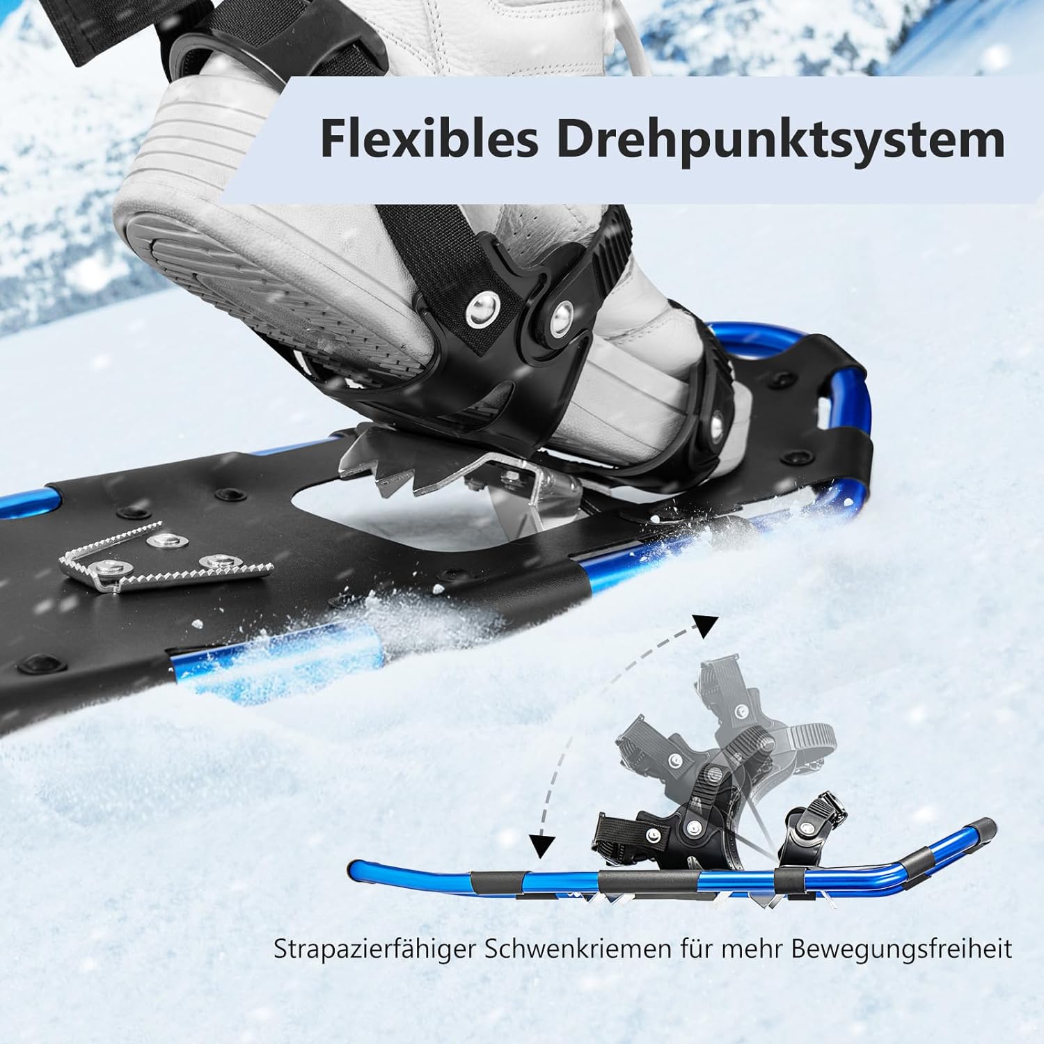 - ﹟ Bequemes & ergonomisches Design ﹟ Mit einem schlanken Design und leicht nach oben gewölbtem, abgerundetem Heck bieten die leichten Schneeschuhe maximalen Auftrieb und schnelles Vorankommen in verschneiten Gebieten. Die starken Aluminium-Stollen an