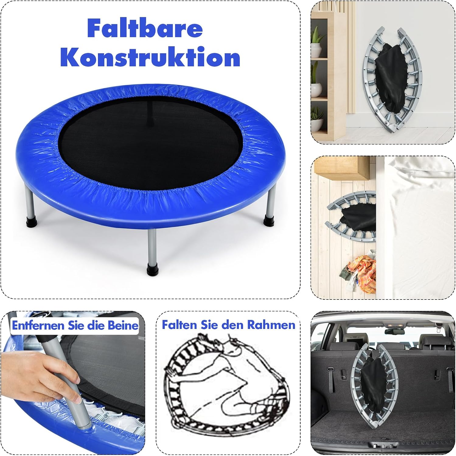 - ﹟ Klappbares Design ﹟ Das Trampolin lässt sich in nur wenigen Minuten zusammenklappen und hinter der Tür oder im Kofferraum verstauen. Dank der detaillierten Anleitung wird Ihnen der Aufbau zudem schnell gelingen.