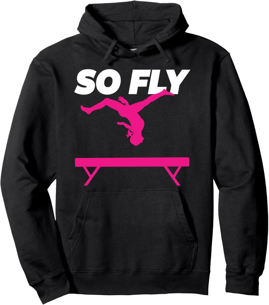 PRODUKTBESCHREIBUNGEN SO FLY. Grafik einer weiblichen Turnerin in Hot Pink, die eine Übung auf dem Schwebebalken ausführt. Sportliches Design für Fans, die weibliche Athleten, Sportlerin, und Mädchensport unterstützen. Gymnastik Frauen Mädchen Turnerin Schwebebalken Rosa. Womens Gymnastics Gymnast Athlete Training Tees Mehr