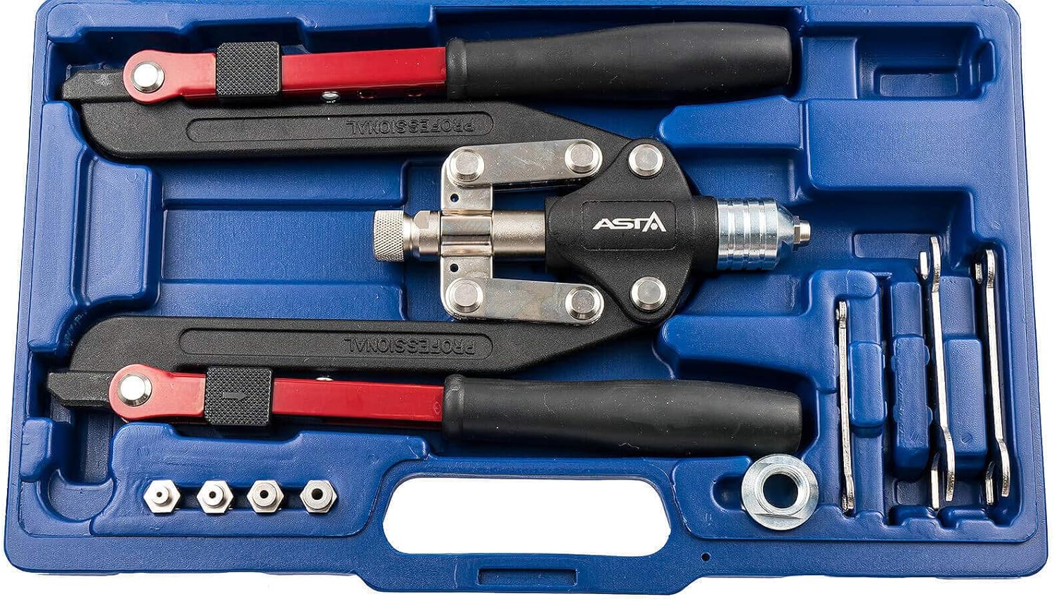 - 14 teiliger Satz Nietzange in Scheren Ausführung mit langem Hebelarm - geeignet für Normnieten aus Stahl und Aluminium von 2.4 bis 10 mm sowie für Nietmuttern aus Stahl und Aluminium (NICHT für Edelstahl oder VA Nieten geeignet)